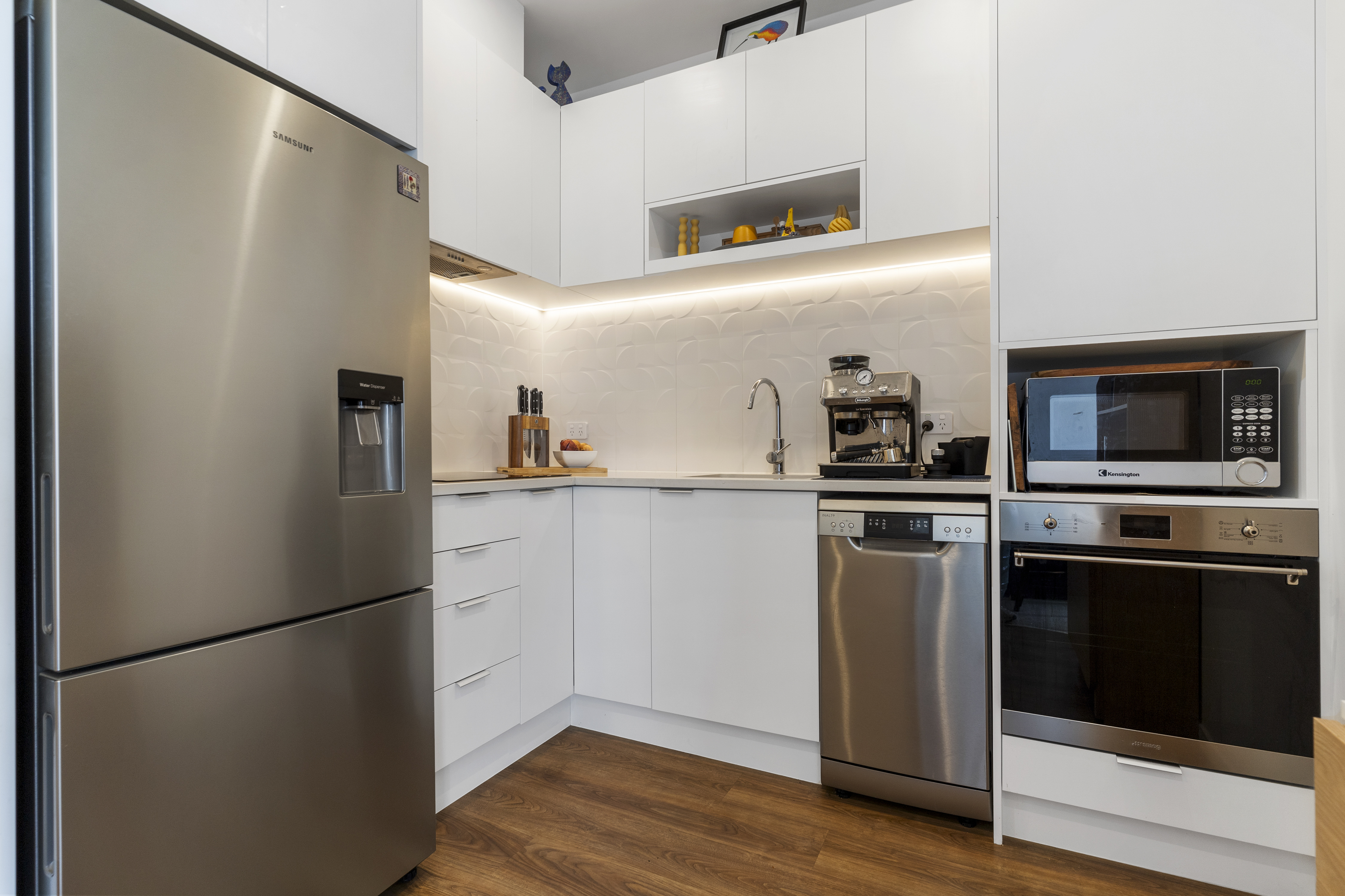 The modern kitchen showcases quality finishes, sleek cabinetry and ample storage, reflecting the apartment's elevated design aesthetic throughout. Two well-proportioned bedrooms are complemented by a contemporary bathroom and excellent in-built storage, delivering both style and practicality.