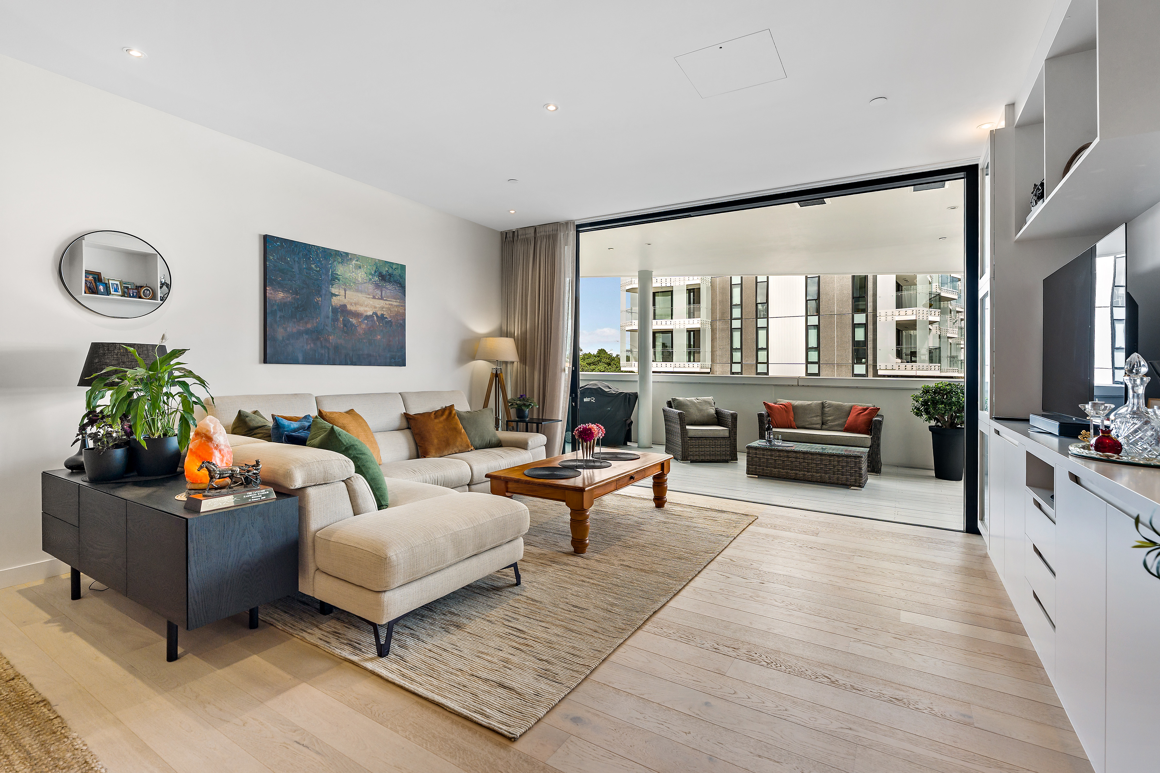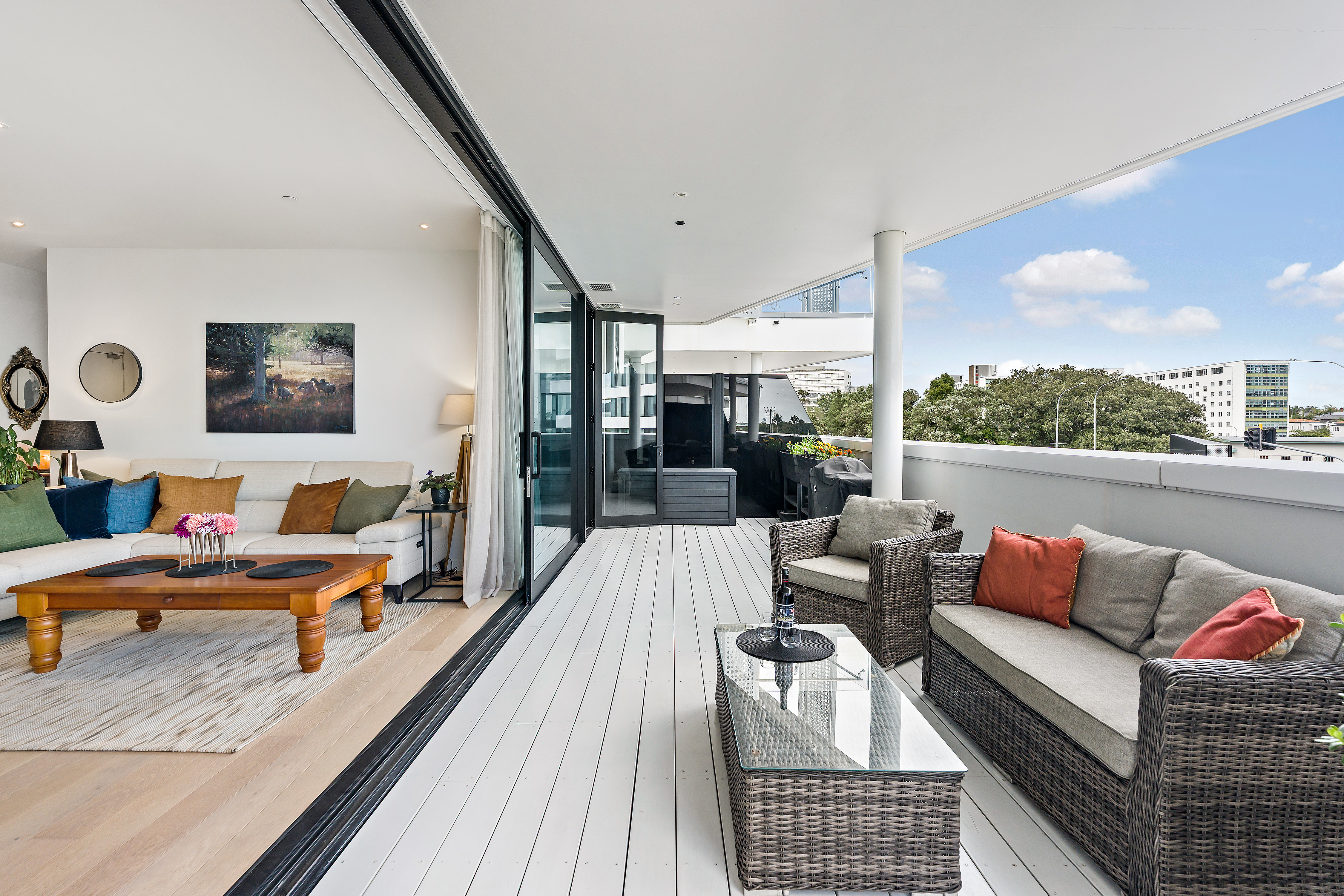 Large sliding doors extend the living environment outward to a substantial covered balcony that has become a true extension of the home. Generous in scale and protected from the elements, it functions as an additional living room throughout the year, ideal for entertaining or simply enjoying the outlook across Alexandra Park and the surrounding landscape.
