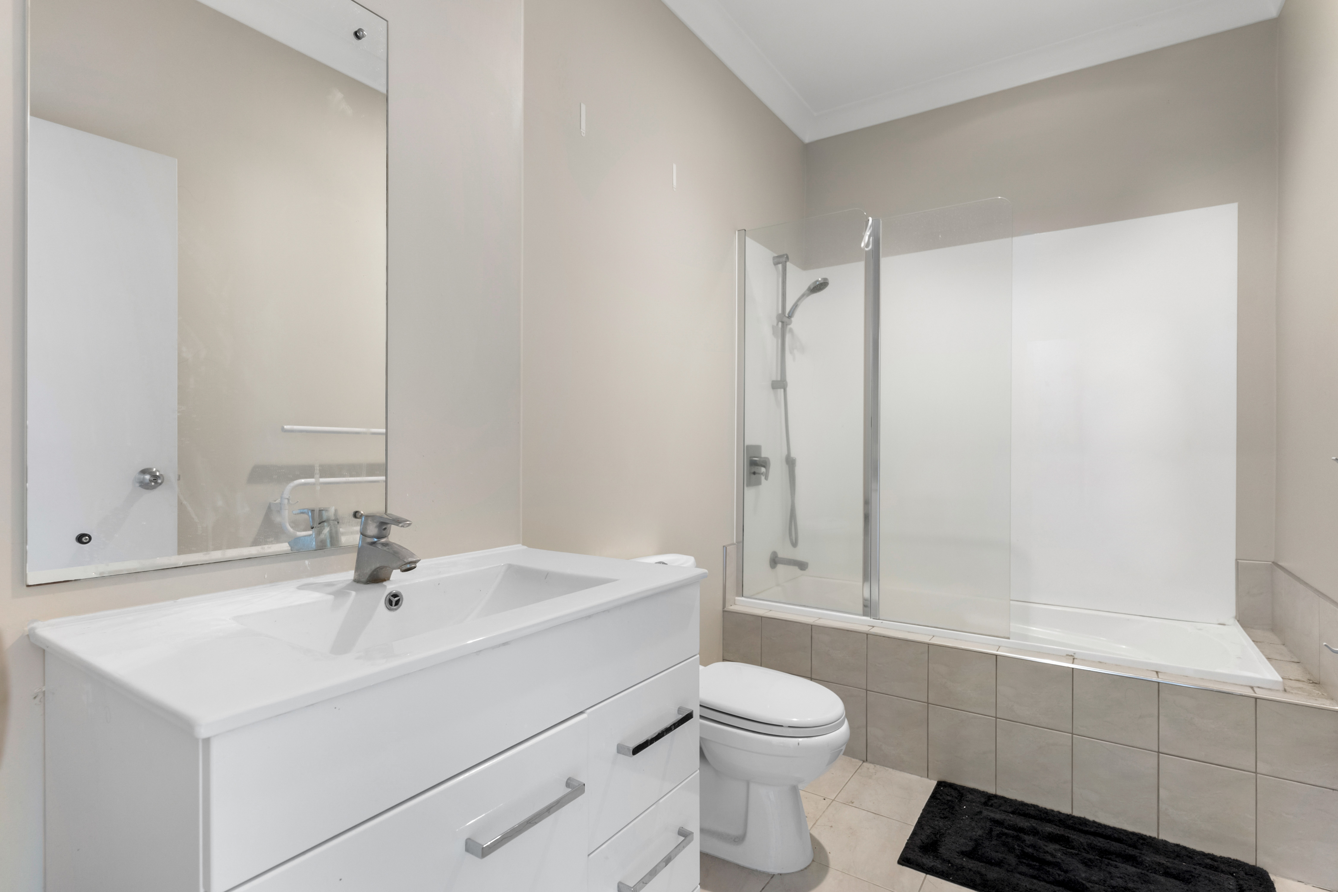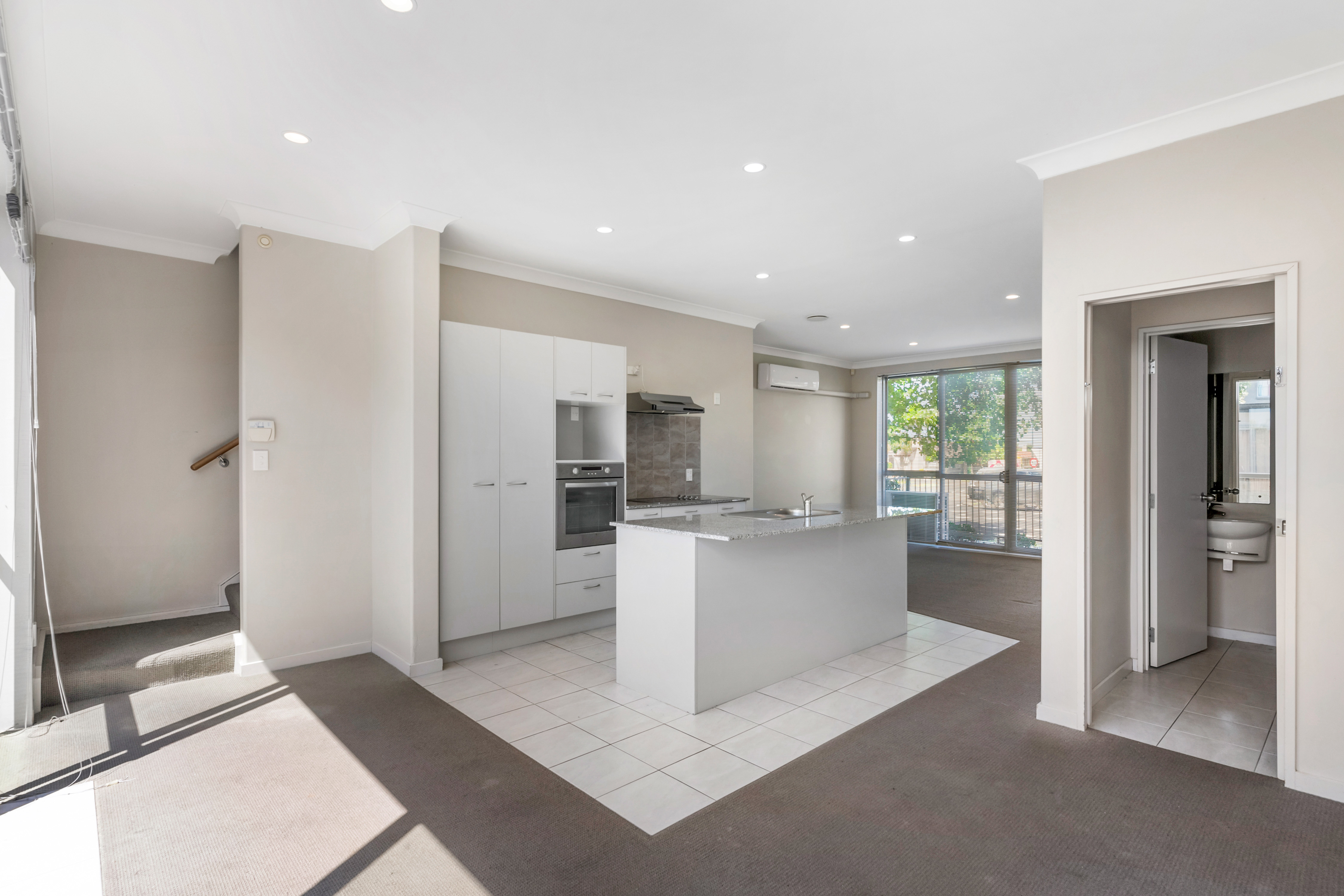 Downstairs, the open plan kitchen, dining, and living area creates a warm and welcoming atmosphere. The kitchen features tiled flooring, an above bench oven, cooktop, range hood, sink and dishwasher, along with ample beige cabinetry for excellent storage. A separate laundry and a guest powder room (WC and vanity) add everyday convenience.