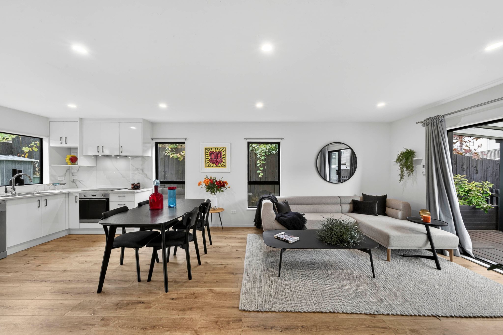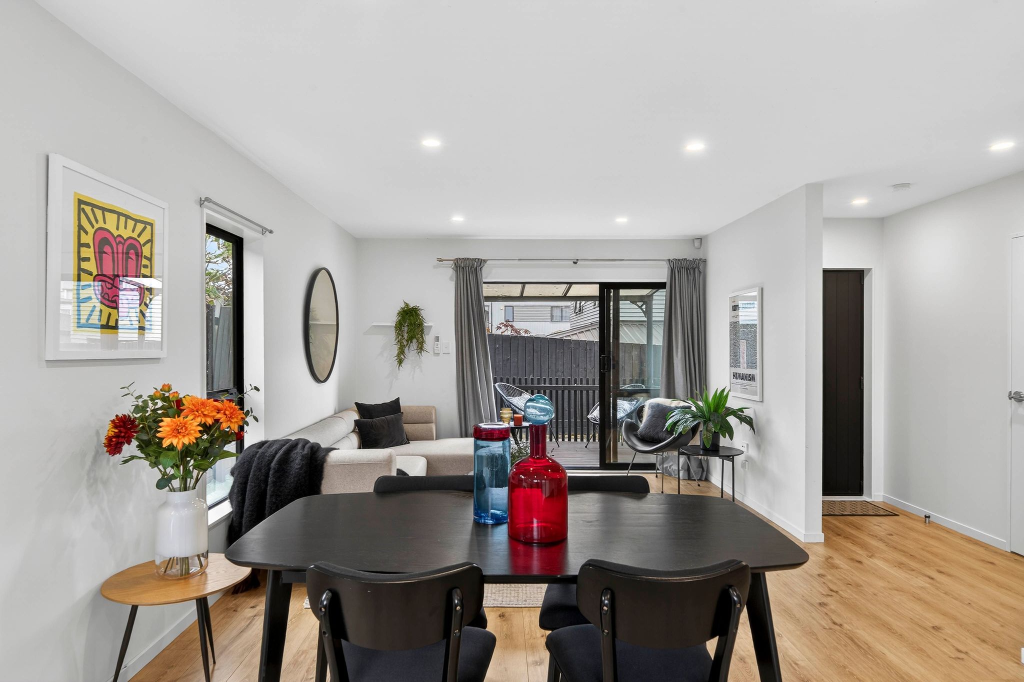 Built in 2021, the home offers a clean, modern aesthetic with a layout designed for easy, everyday living. The open-plan living area connects seamlessly to the outdoor spaces, creating multiple options for entertaining or unwinding, while the additional light from its end position enhances the feeling of scale throughout.