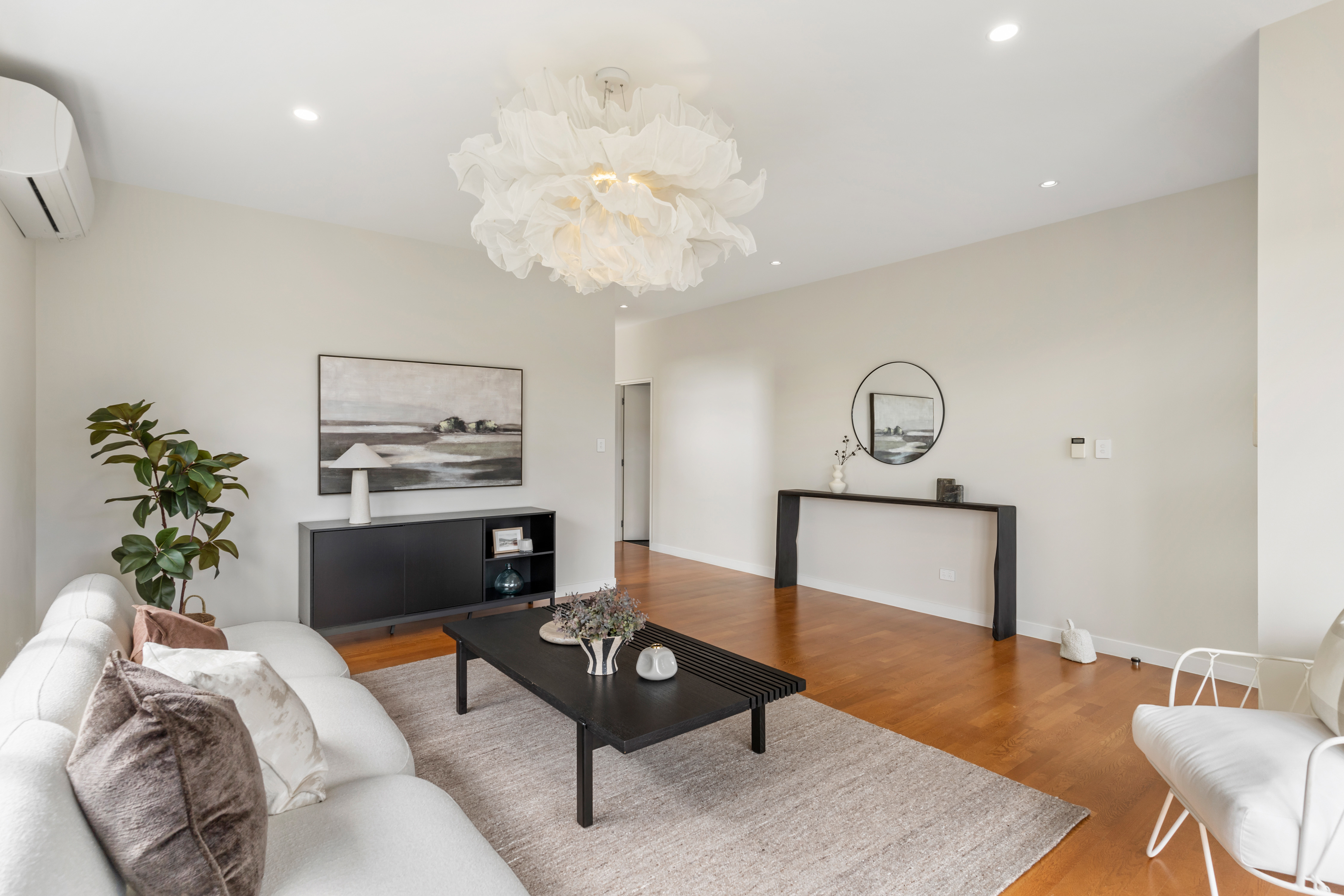 The main living, dining, and kitchen zone is generous in scale and thoughtfully configured. Wide sliders open to outdoor entertaining areas, strengthening the connection between inside and out. Timber flooring, clean lines, and a modern colour palette create a timeless and high quality aesthetic.