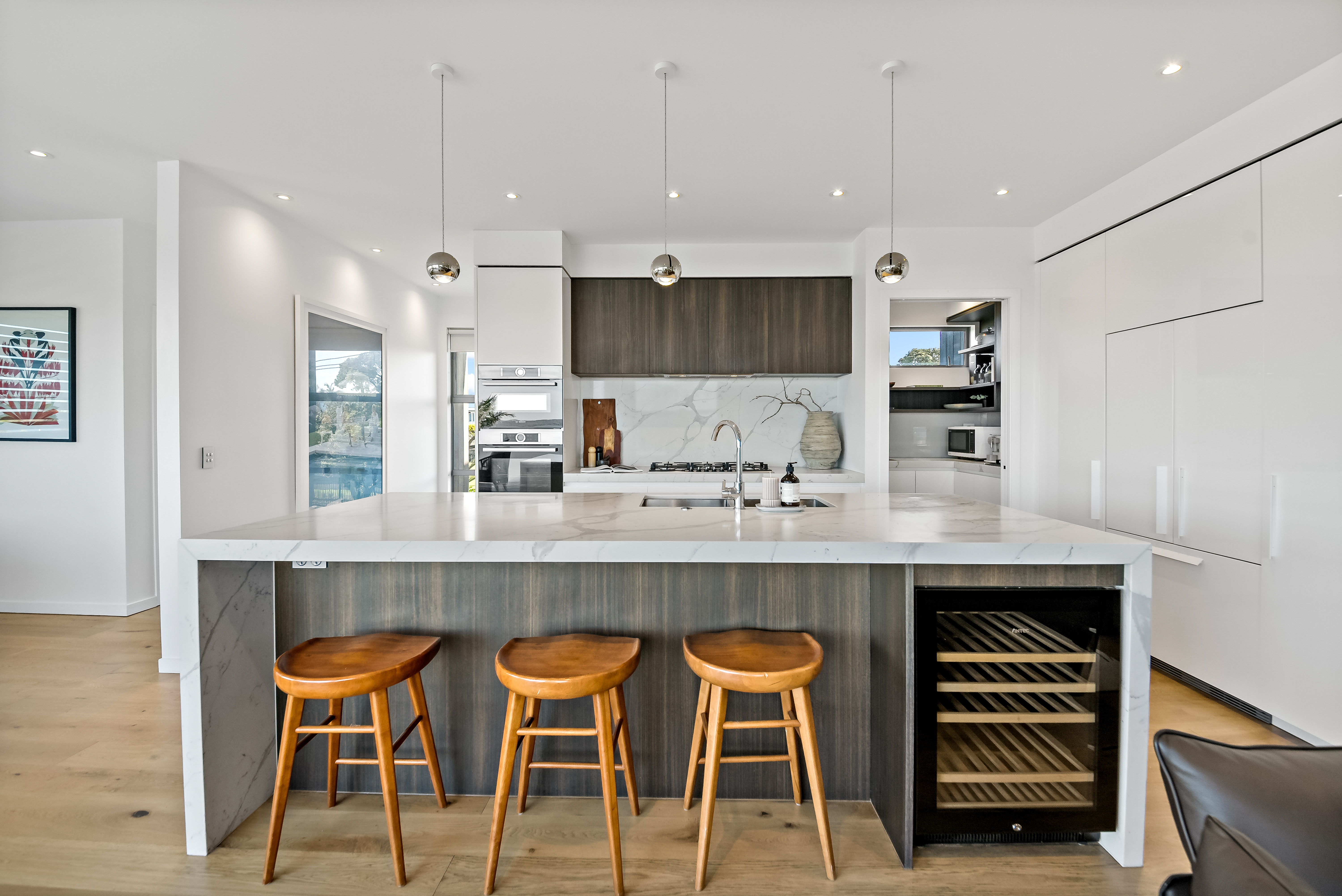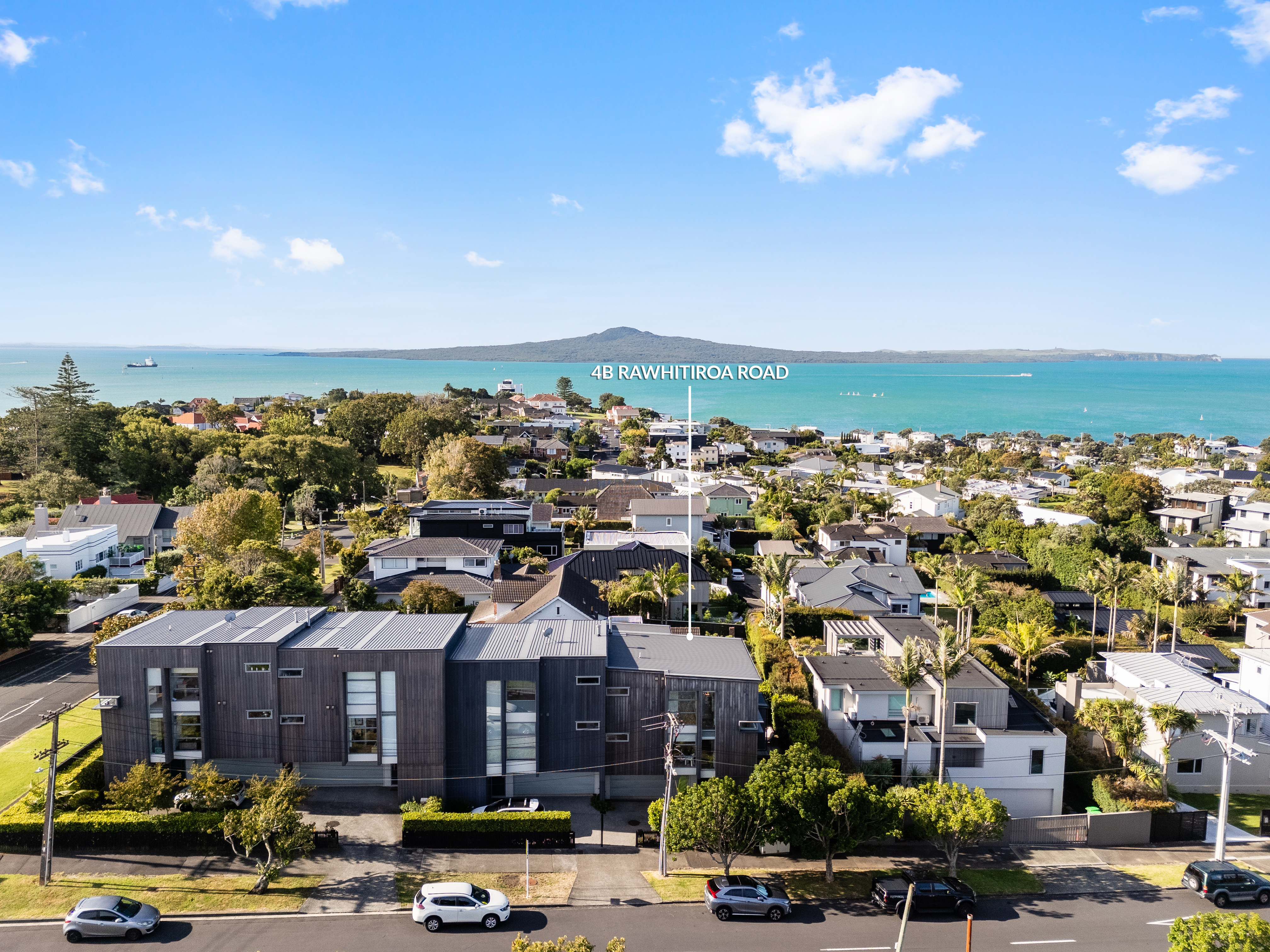 Completed in 2020 and positioned to capture sweeping views across the Waitematā Harbour to Rangitoto, the home unfolds across three thoughtfully designed levels, offering approximately 250m of beautifully modern living on a freehold 251m site.