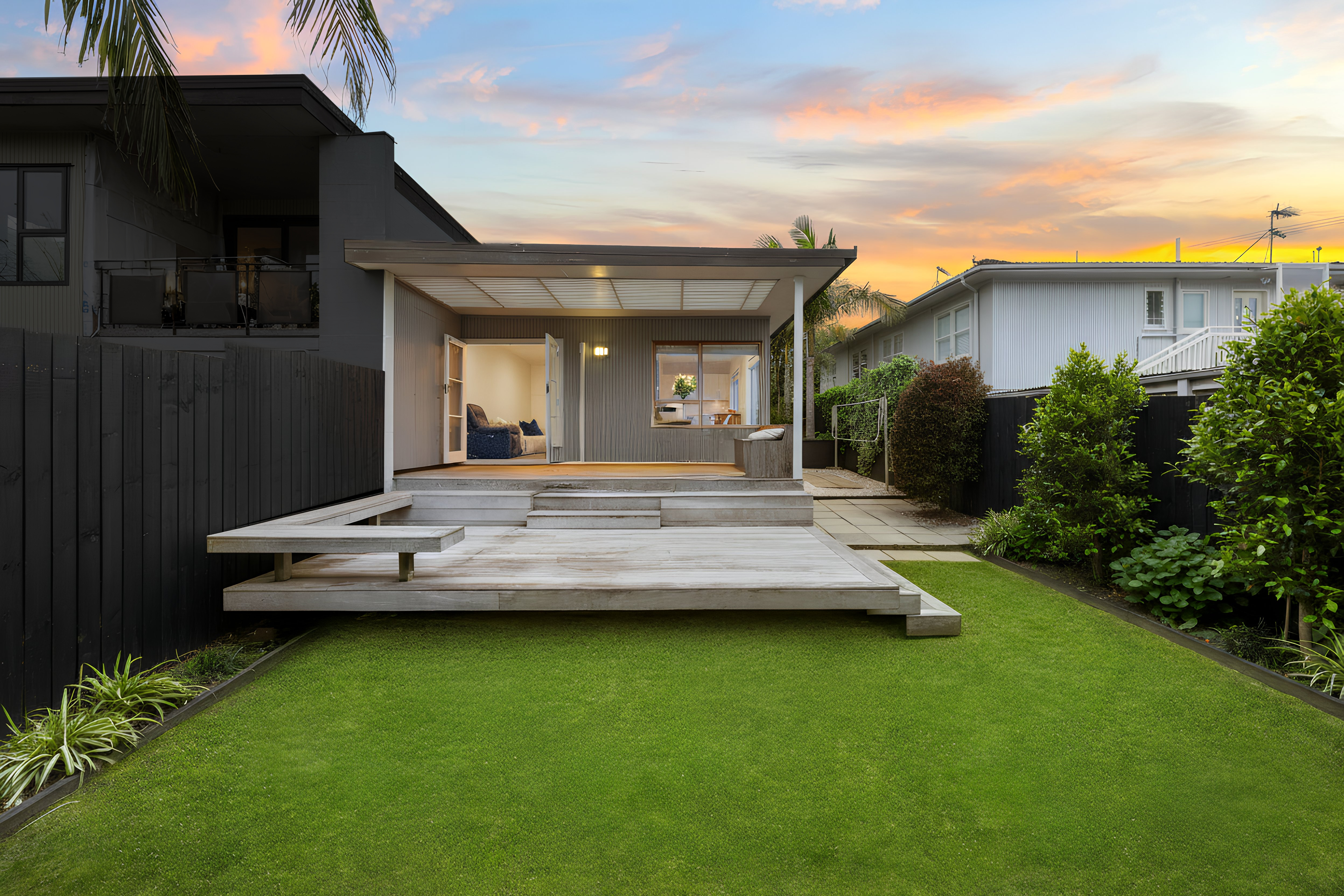 * Flat, north-facing backyard framed by tropical plantings and a covered entertaining deck-a standout feature for relaxing or hosting year-round.