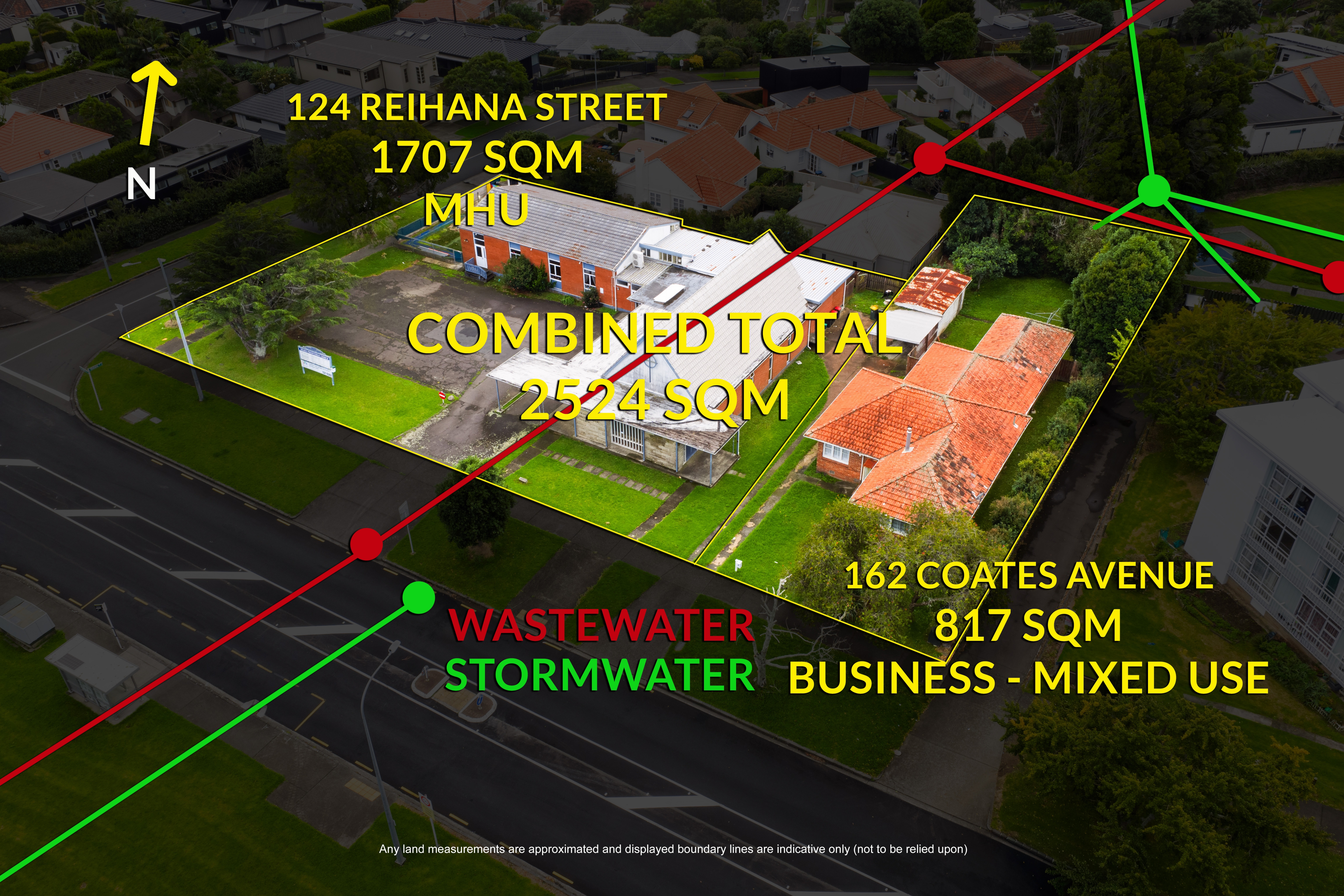 Development Highlights: • Ridgeline elevated position with flat rectangular corner site • 124 Reihana: 1707 m², MHU (Mixed house urban zone) • 162 Coates Avenue: 817 m², Business-Mixed use zone • Prominent corner site spanning approximately 2,524 m² • Surplus to vendors' requirements - offering vacant possession • Substantial site in a premium residential suburb • Favourable positioning within an established neighbourhood • Strong demand for high-quality housing in the area • Potential for redevelopment, intensification, or repositioning (subject to council approval)
