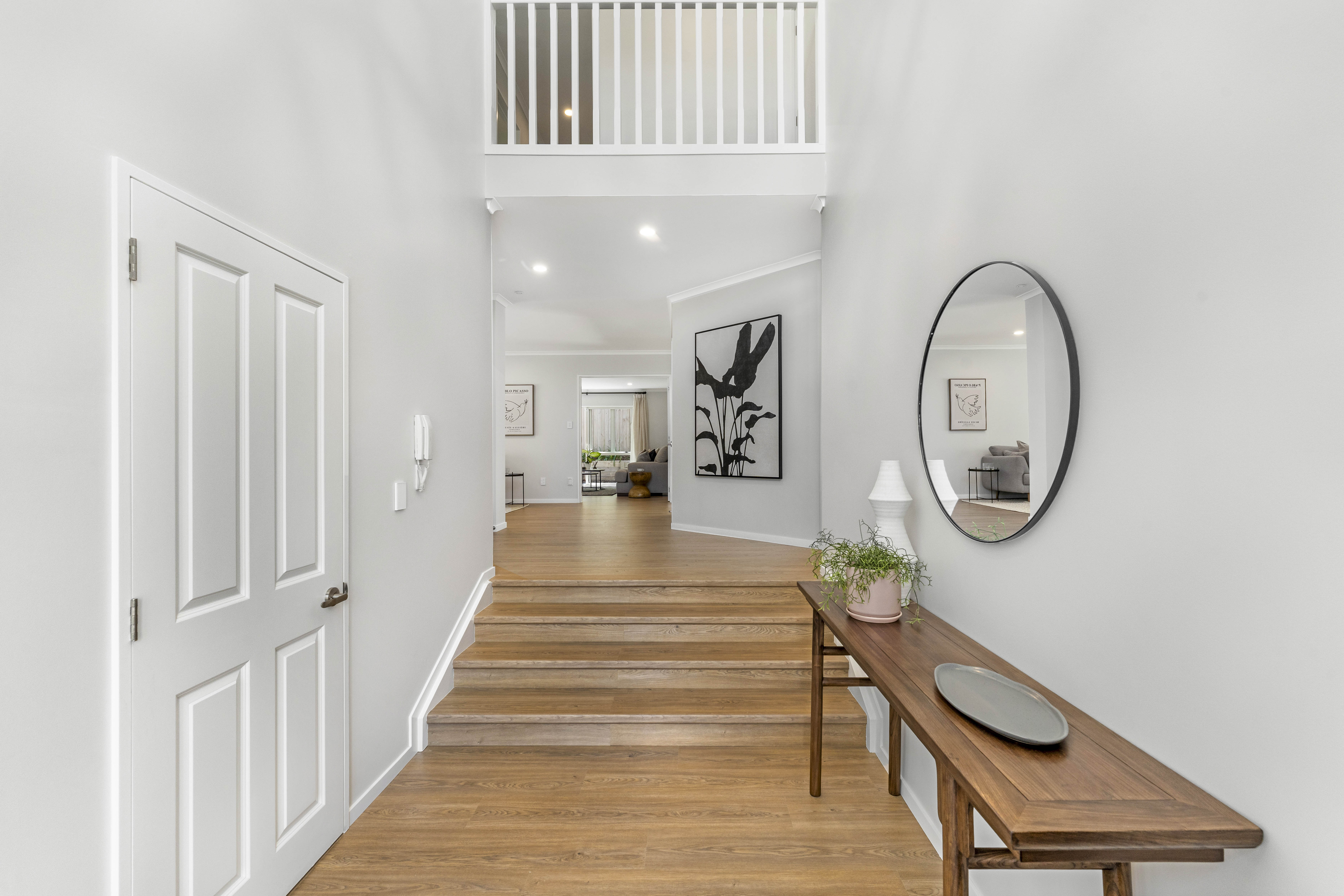 The grand, vaulted entrance sets the tone for what's to come, flooding the home with natural light and creating an immediate sense of warmth and welcome.