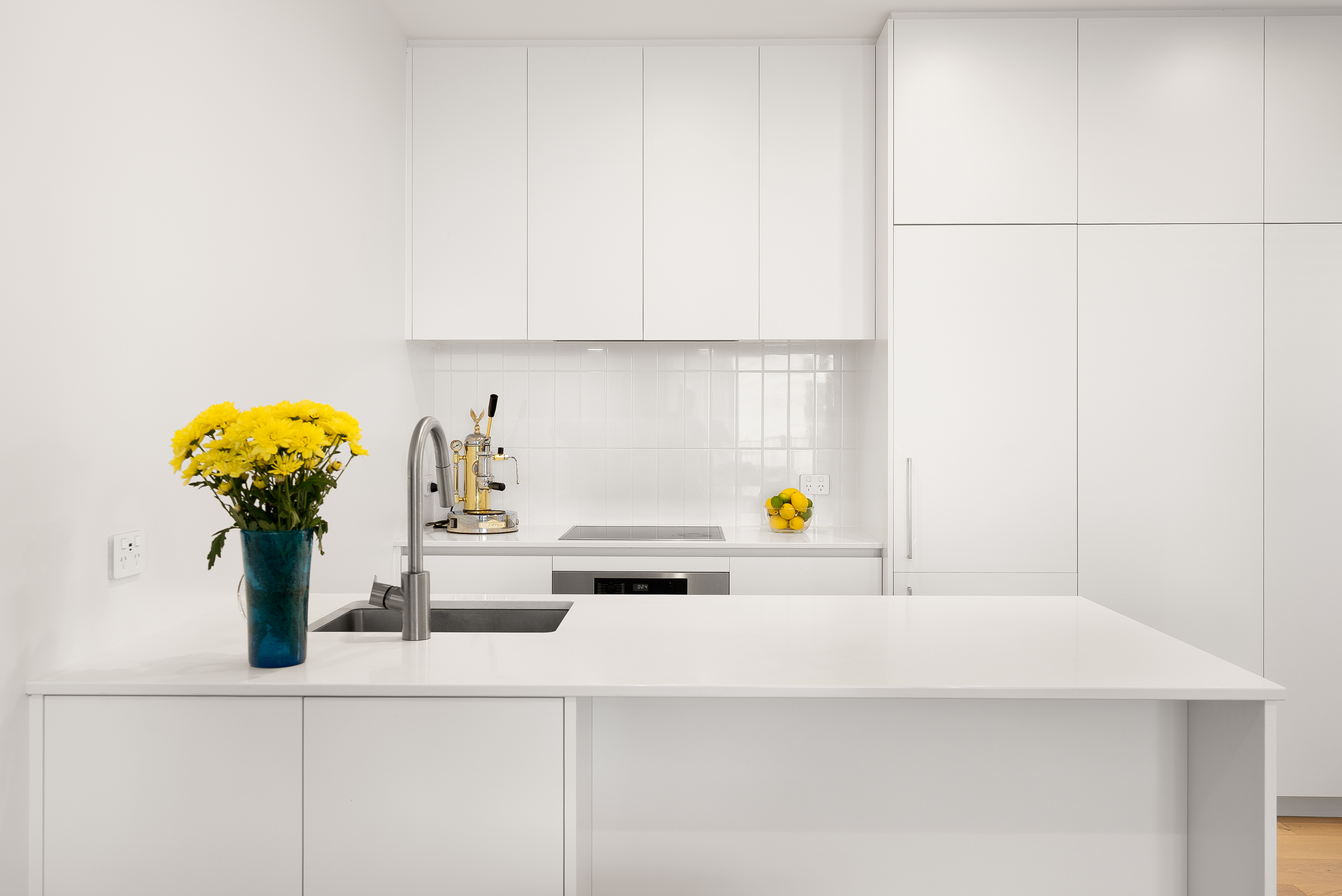 The ground floor is where the home opens up. A generous stud height enhances the sense of space, while natural light moves easily through the open-plan living and dining zone. The kitchen is both functional and refined, with clean-lined cabinetry, premium Miele appliances, and engineered European Oak underfoot. From here, living flows seamlessly to a private, north-facing courtyard - sun-filled, sheltered, and well suited to both entertaining and everyday unwinding. Furnishings on this level can remain for tenant use if desired + built in fridge / freezer.