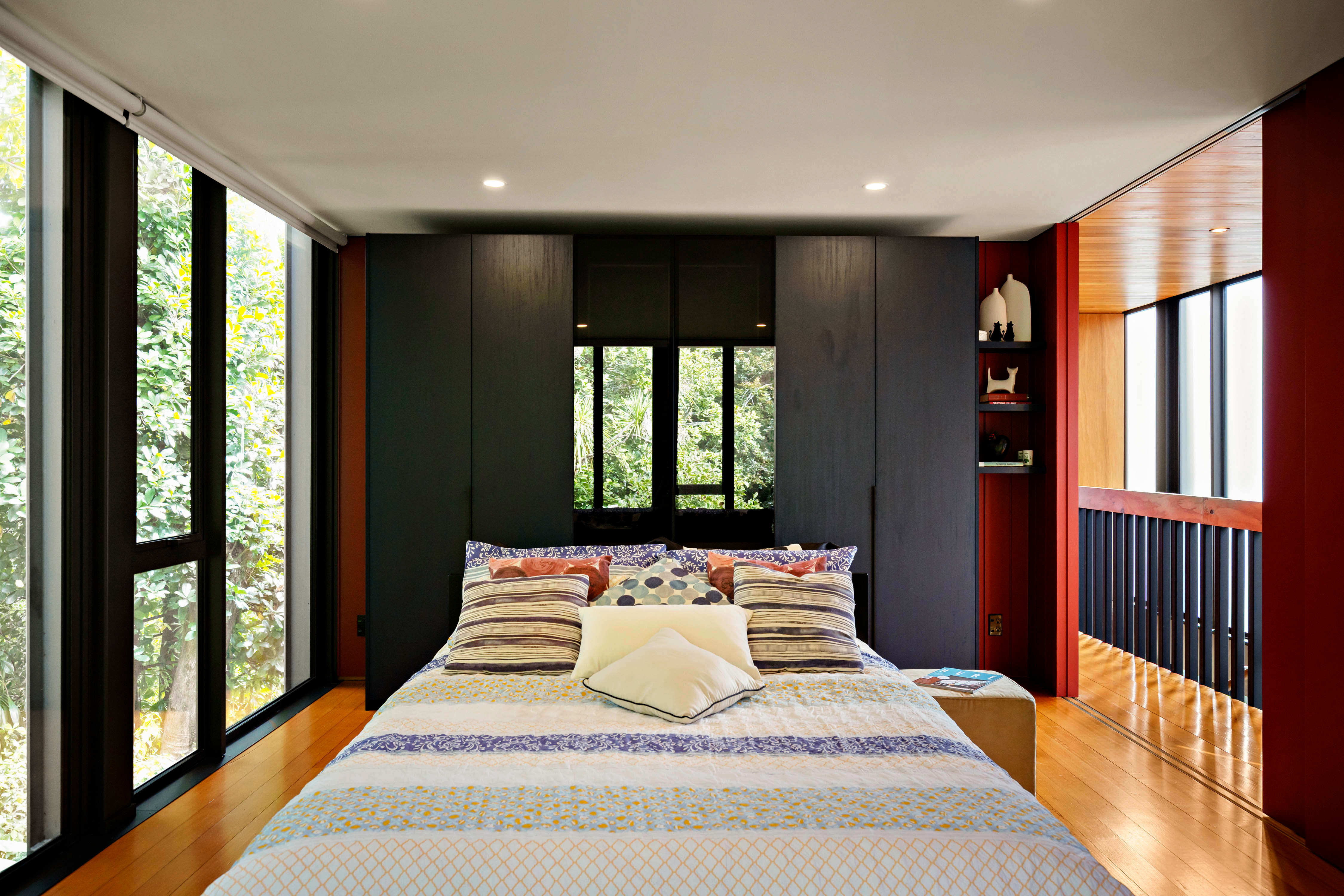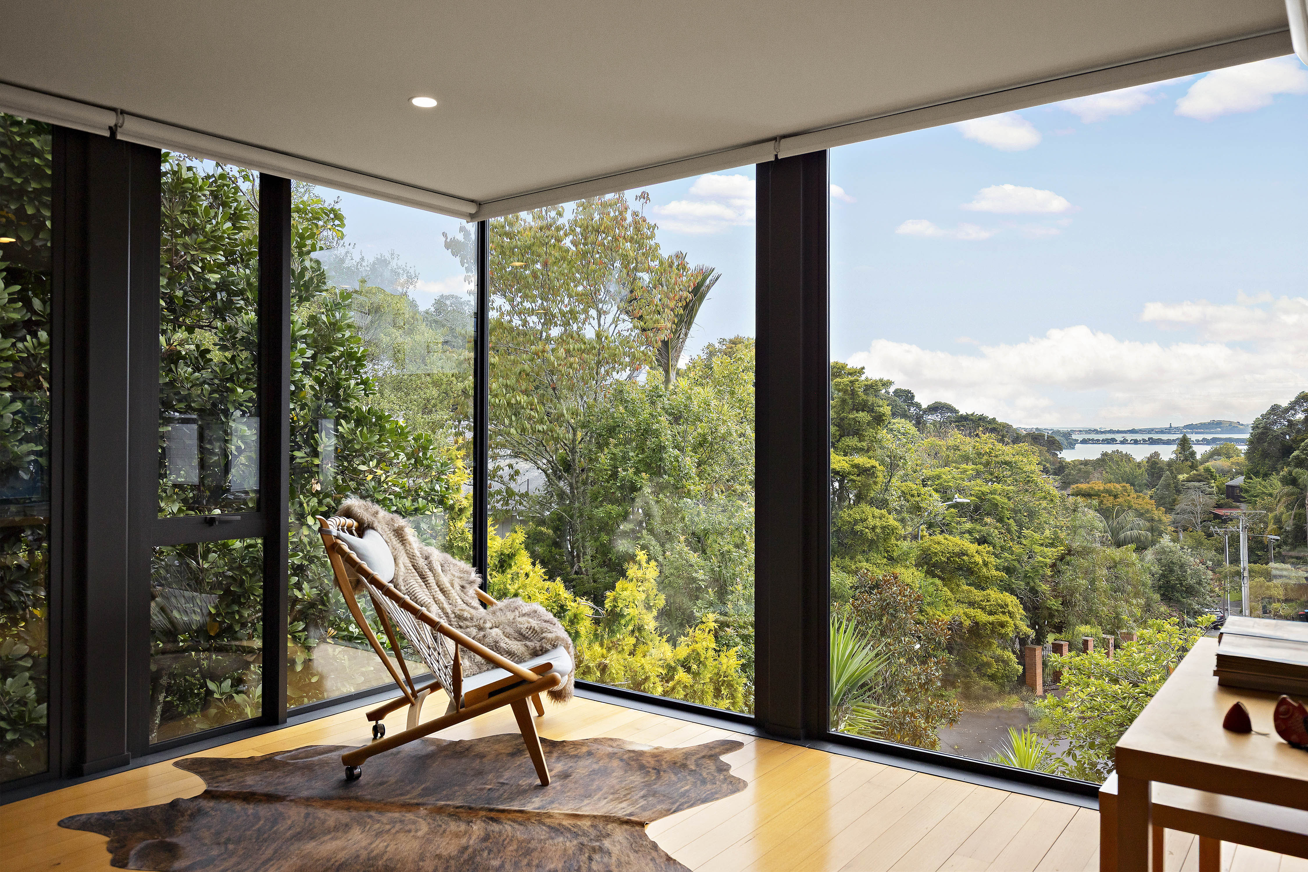 The gardens are an essential part of the composition; beautifully established and carefully arranged. Above it all, a roof terrace offers an elevated outlook across the surrounding treescape to the water - a striking vantage point that completes the home's layered design.