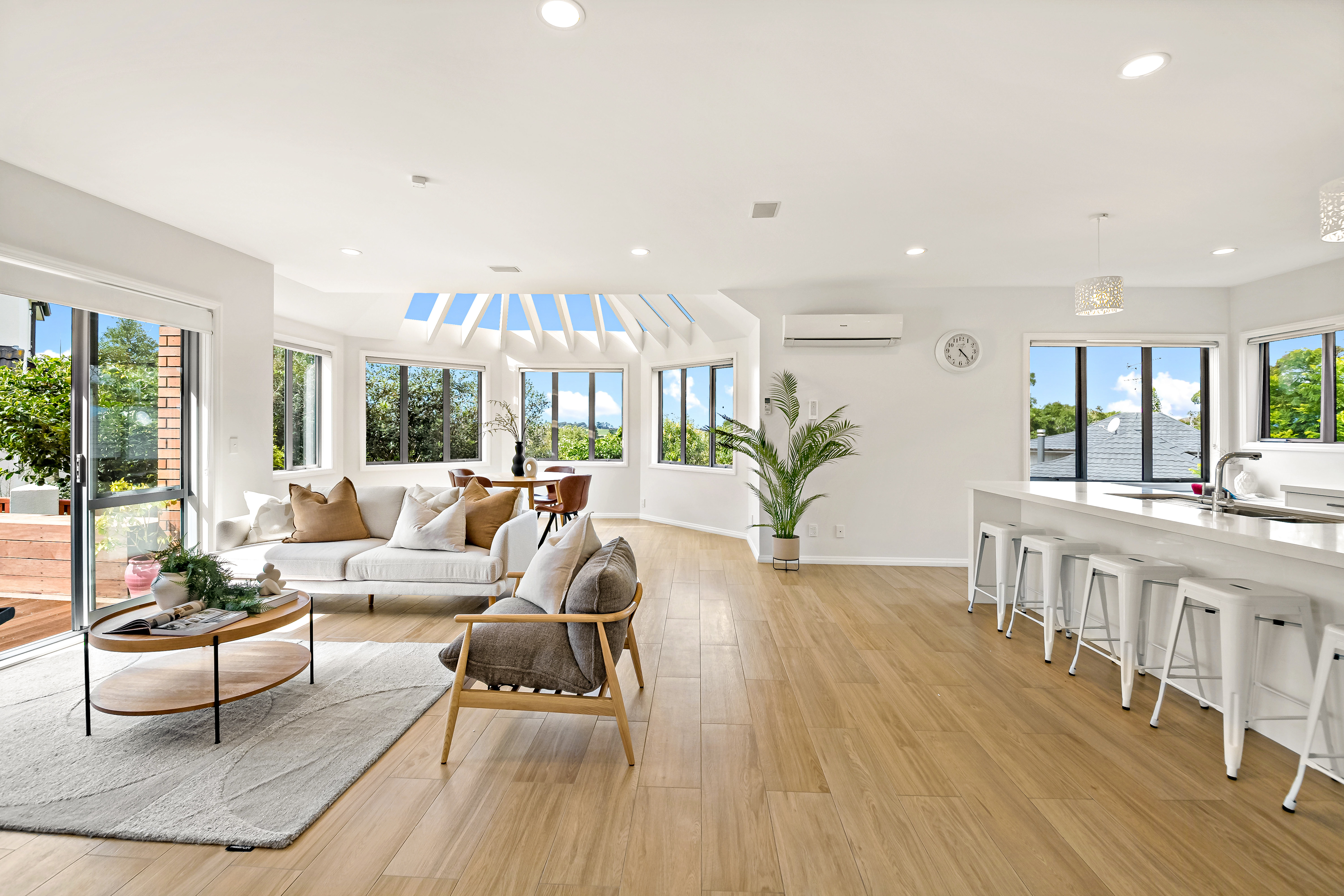 • The two distinct living areas and two dining spaces allow for both connection and separation. Big gatherings can unfold in one zone while another stays available for privacy or to keep the kids in. The open plan dining and kitchen has the feeling of a conservatory - with unique ceiling features letting the sun come flooding in to the pristine and contemporary kitchen.