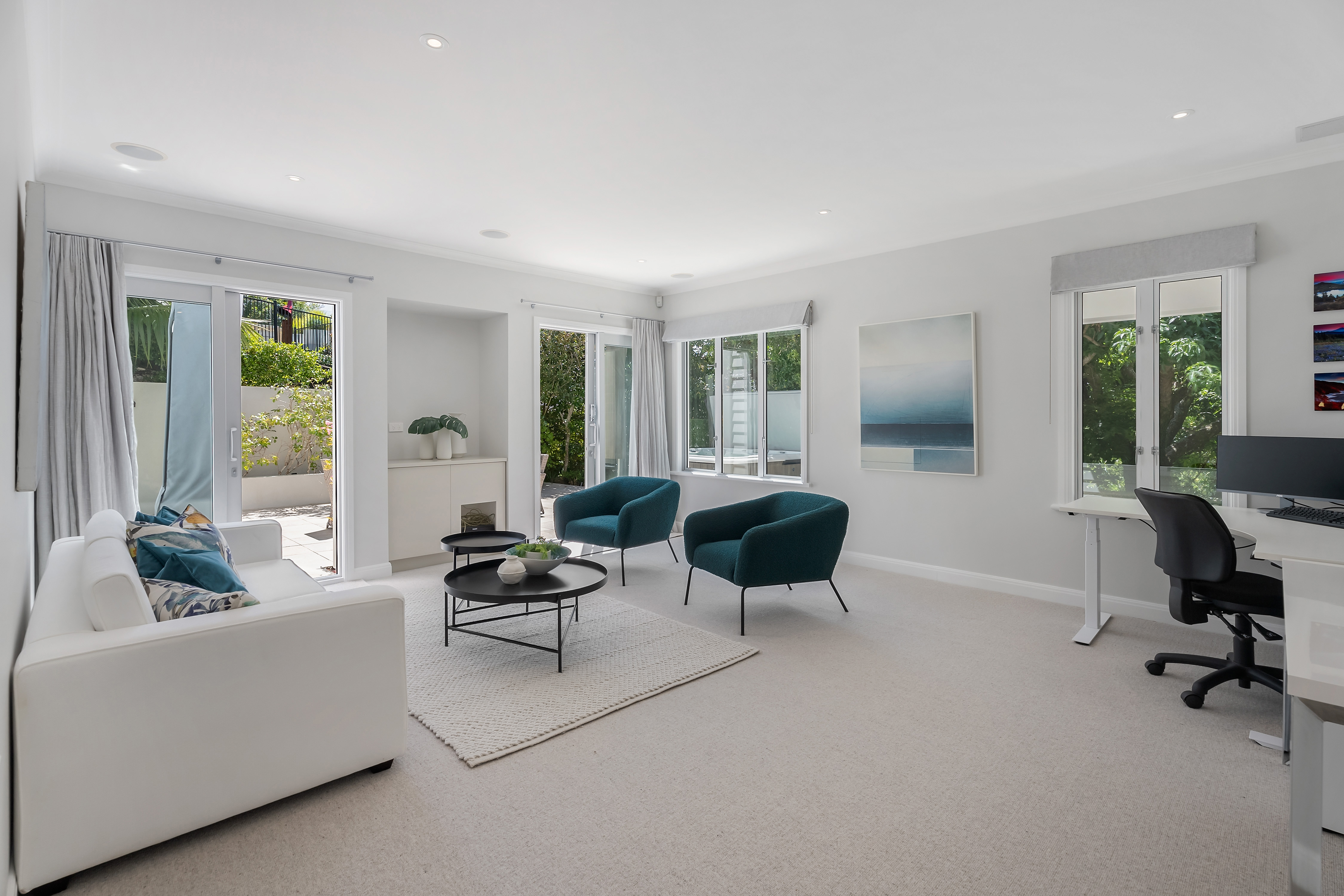 Indoor living flows effortlessly outdoors to a full-width LouvreTec-covered deck, offering a sheltered, all-season setting for entertaining.