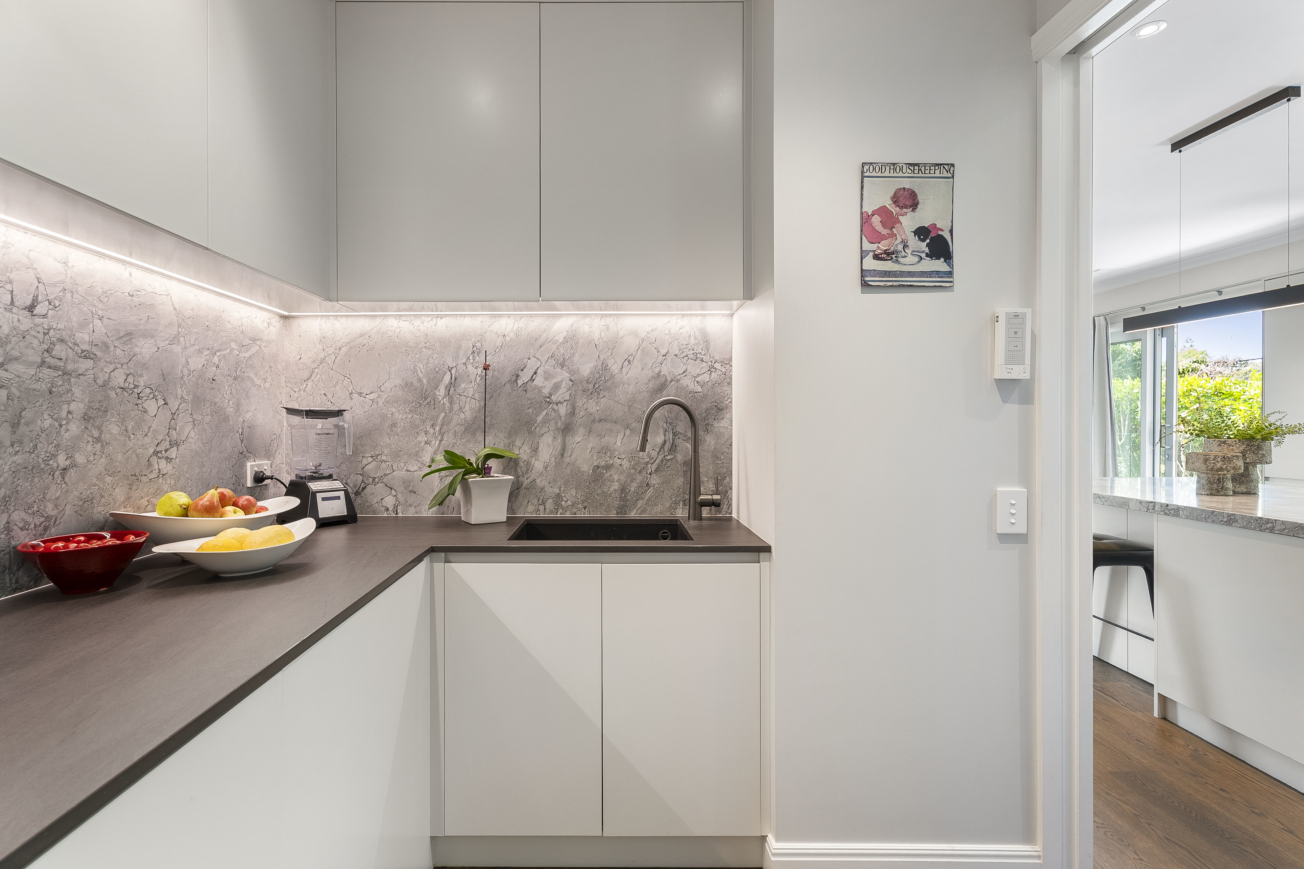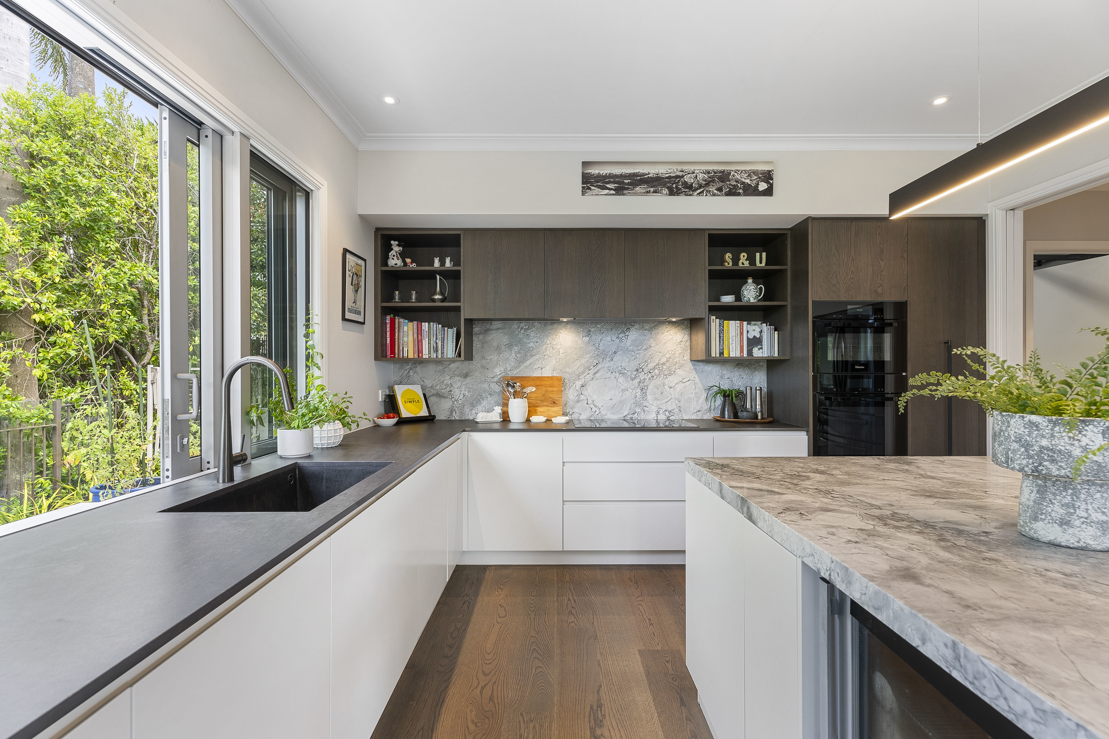 At the heart of the home, the designer kitchen with large scullery is both striking and functional, anchored by a high-spec stone island bench and seamlessly connecting to the family living.