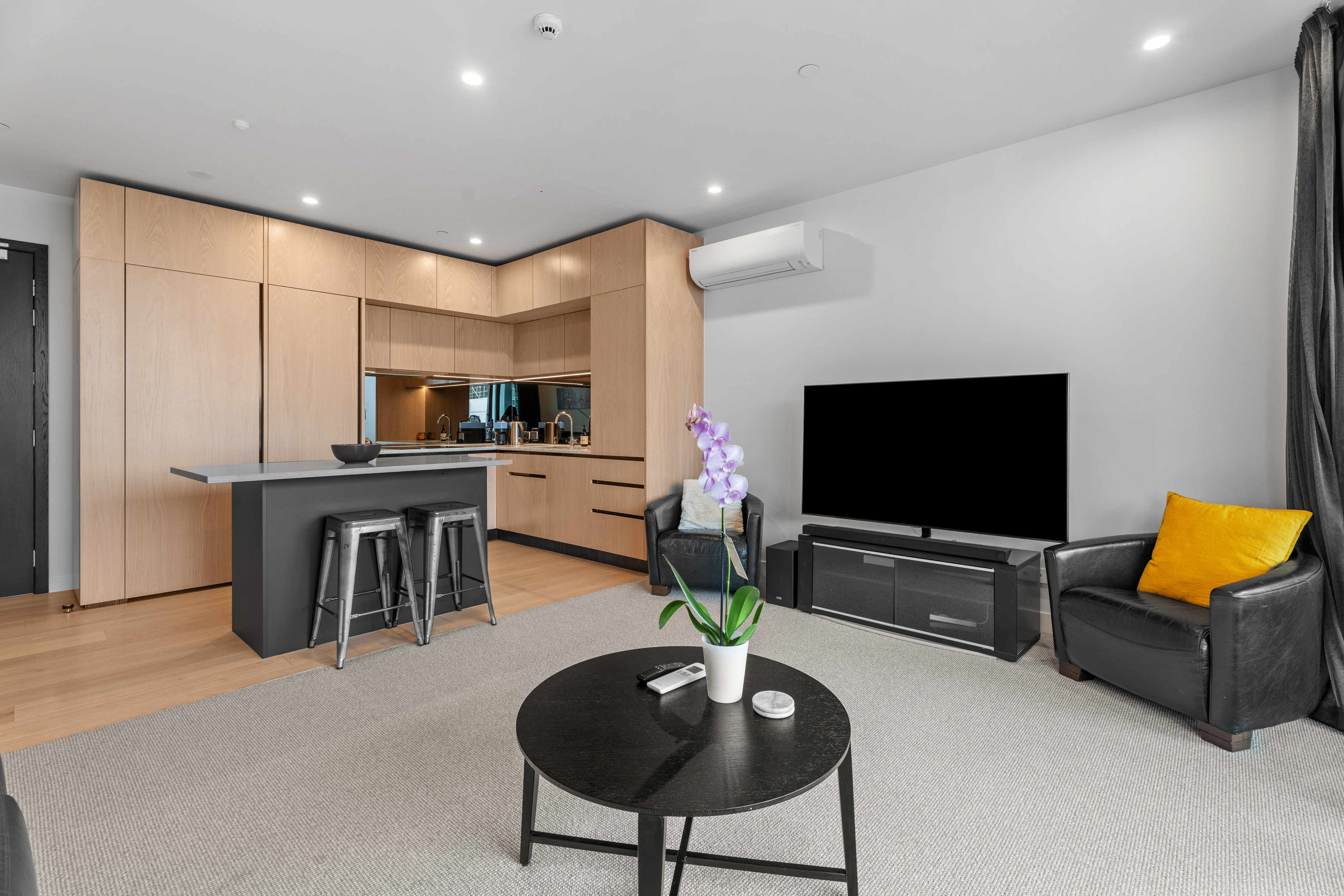 Facing west, enjoying warm afternoon sun, with floor-to-ceiling double-glazed sliders opening to a generous 12sqm covered terrace, perfect for evening drinks after work or returning from a day on the water. Inside, approximately 52sqm of thoughtfully designed living offers contemporary finishes including European appliances, engineered stone benchtops and a fully tiled porcelain bathroom. A vendor-commissioned kitchen island enhances both functionality and flow, a heat pump ensures year-round comfort.