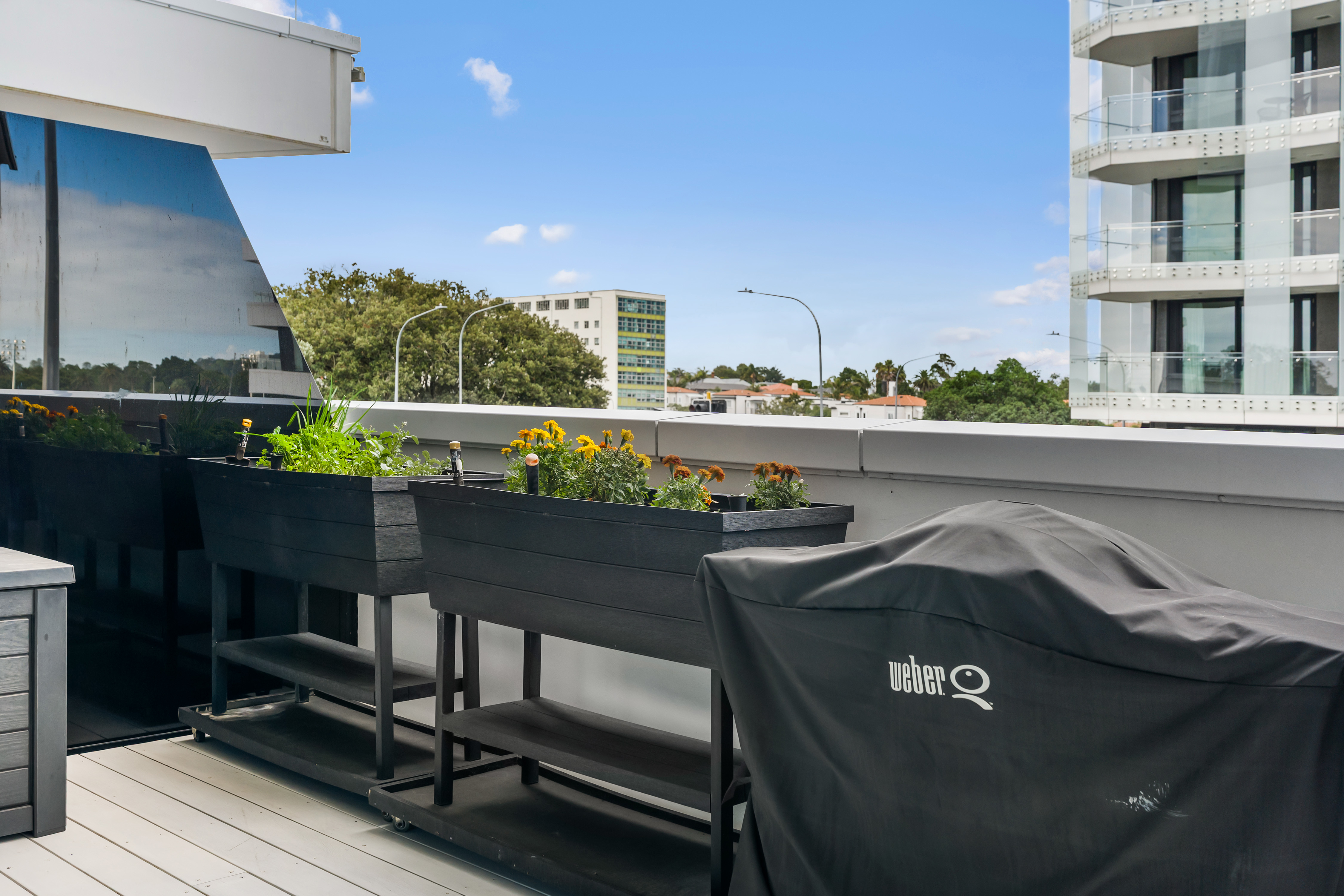Large sliding doors extend the living environment outward to a substantial covered balcony that has become a true extension of the home. Generous in scale and protected from the elements, it functions as an additional living room throughout the year, ideal for entertaining or simply enjoying the outlook across Alexandra Park and the surrounding landscape.