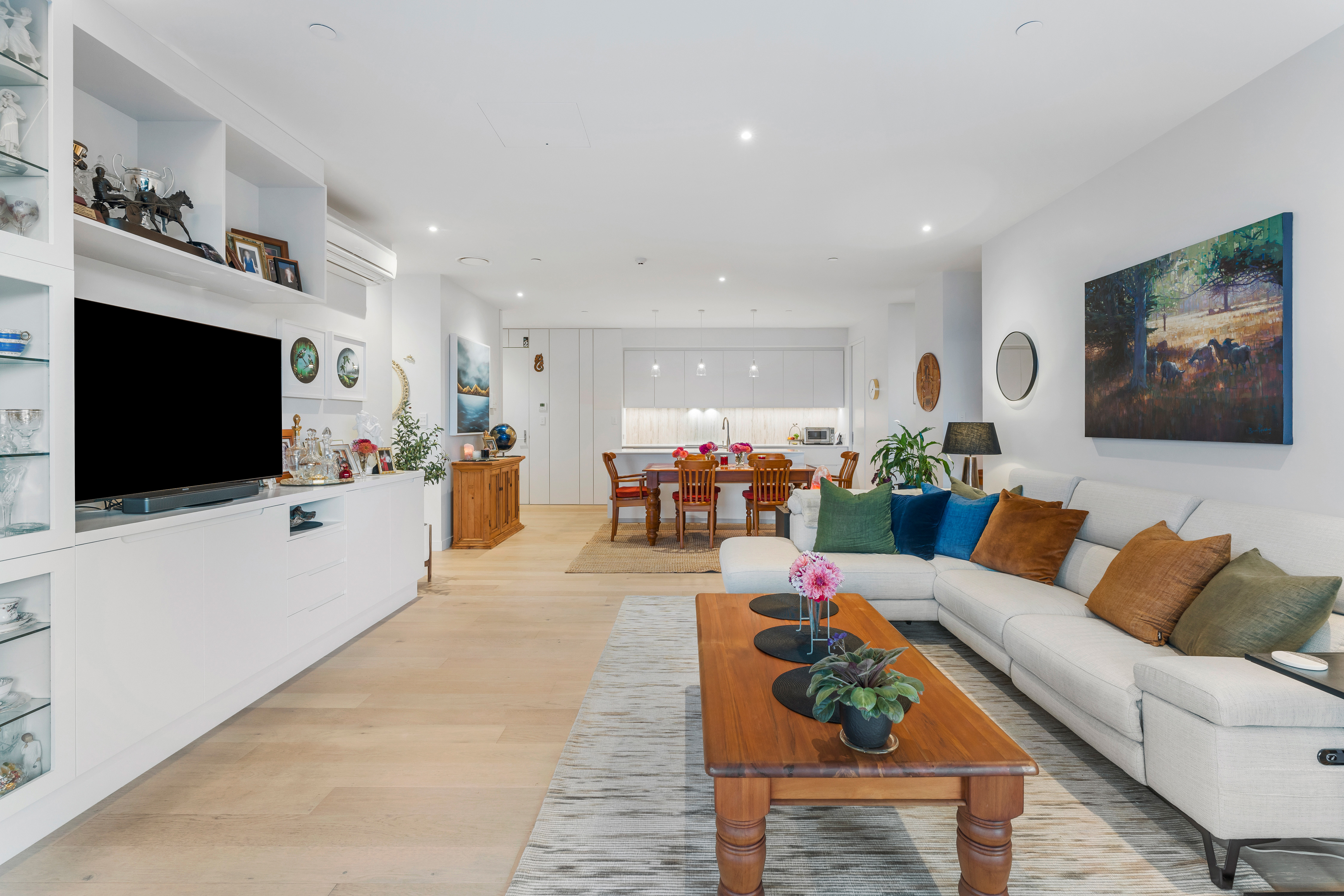 From the moment you enter, the apartment reveals a calm and balanced interior defined by natural light, clean architectural lines and generous proportions. Open plan living connects seamlessly with a well appointed kitchen and dining area, creating a space equally suited to quiet daily living and relaxed entertaining.