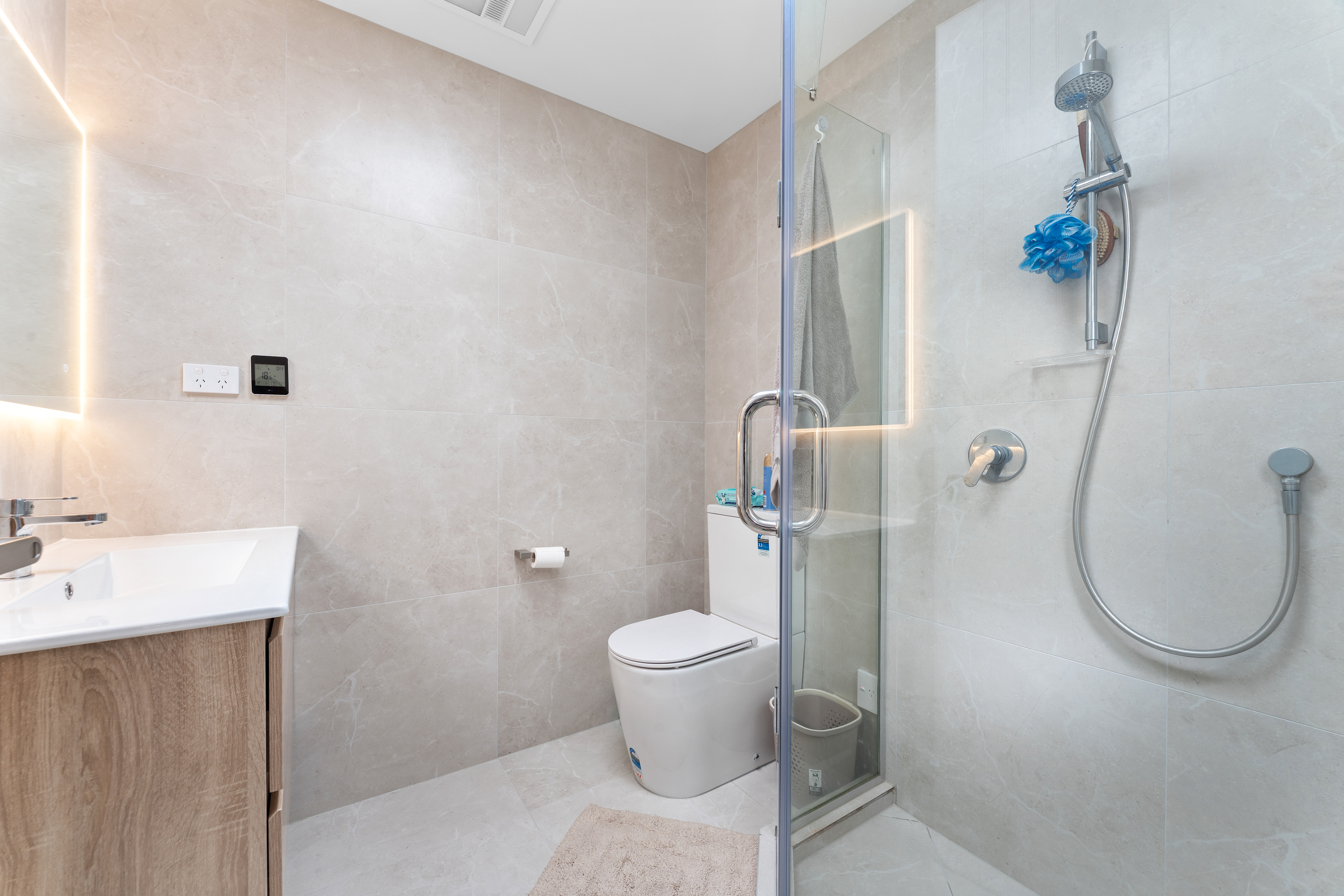 Premium inclusions: Panasonic central air-conditioning system, Panasonic video intercom, CCTV security cameras, underfloor heating in bathrooms, built-in sound system, quality cabinetry and benchtops, stylish bathrooms with LED mirrors, LED lighting throughout, alarm system, double-glazed windows, full insulation, and a private sunny backyard.