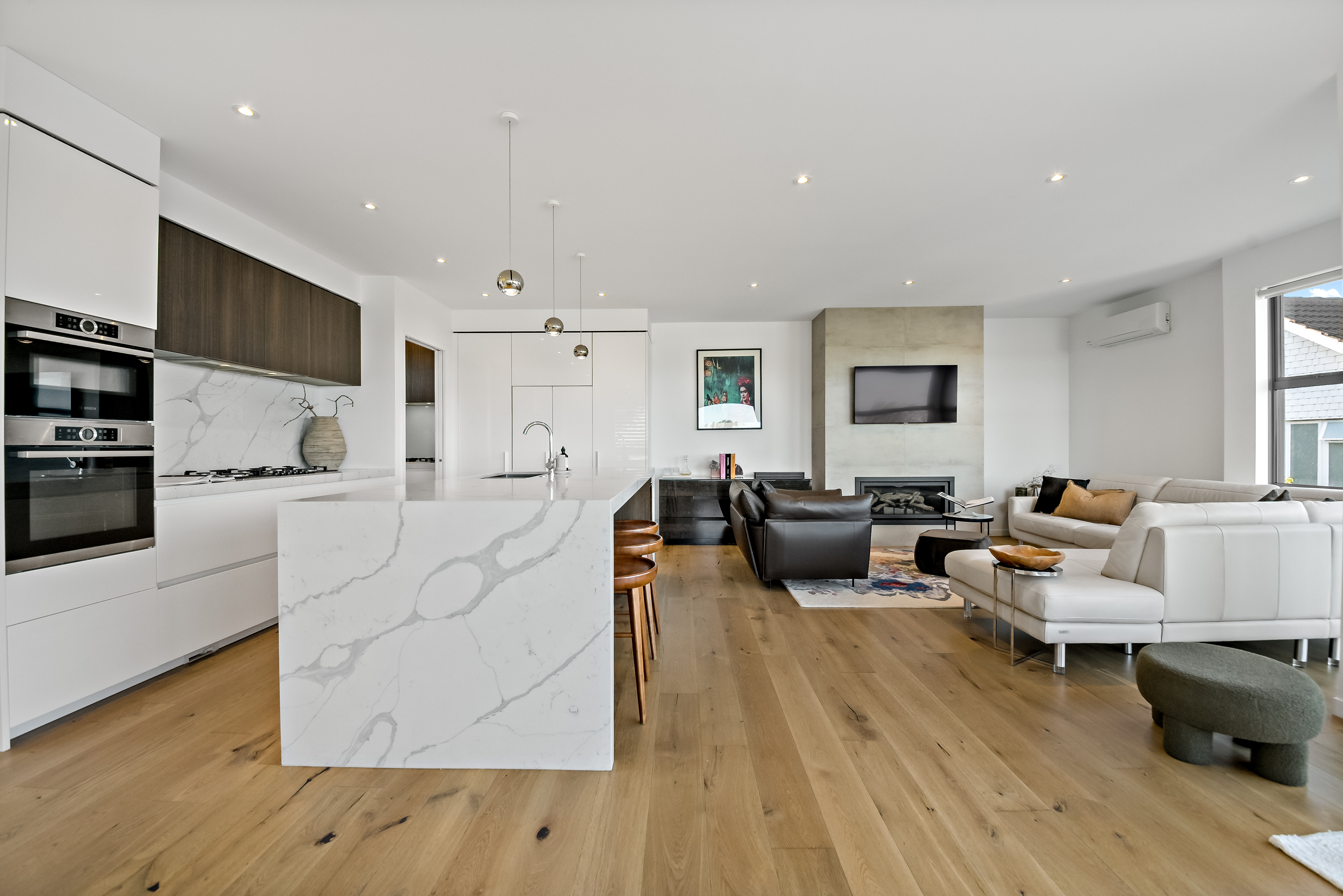 Completed in 2020 and positioned to capture sweeping views across the Waitematā Harbour to Rangitoto, the home unfolds across three thoughtfully designed levels, offering approximately 250m of beautifully modern living on a freehold 251m site.