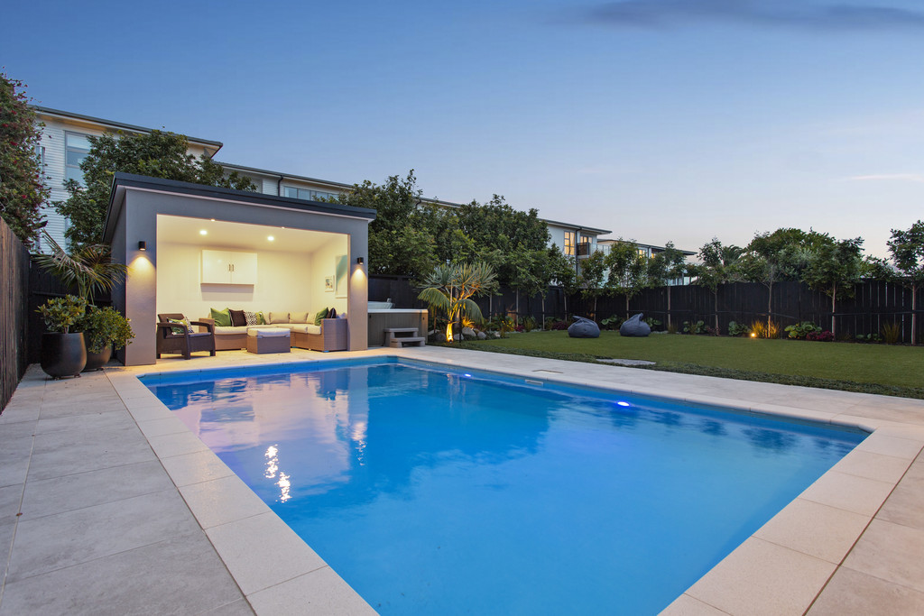French doors provide a seamless transition to the landscaped garden that is bathed in warm northerly sunshine, offering the ultimate play space for children and pets. The poolside cabana, equipped with spa and TV, is a dreamy spot to relax and recharge with friends and family.