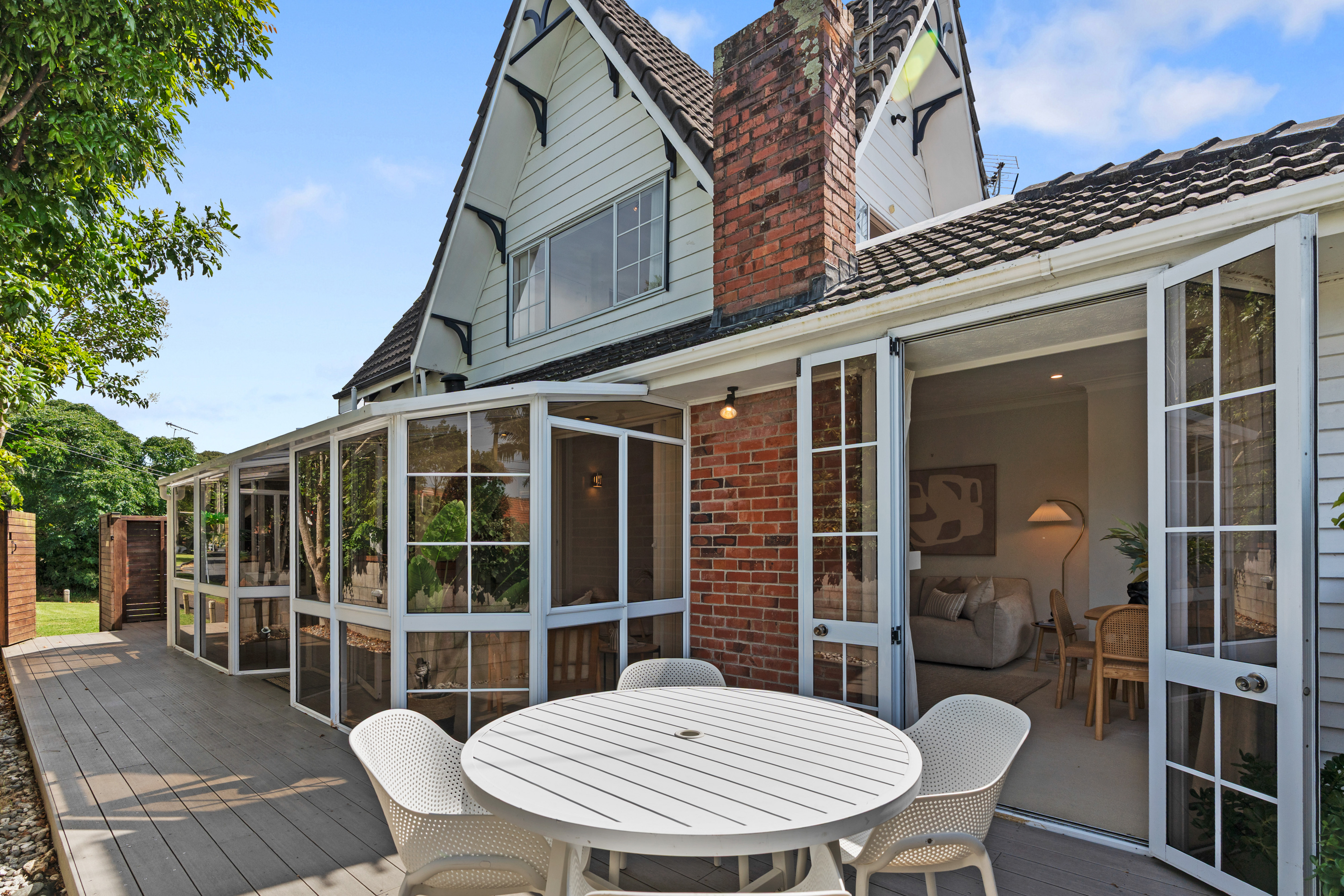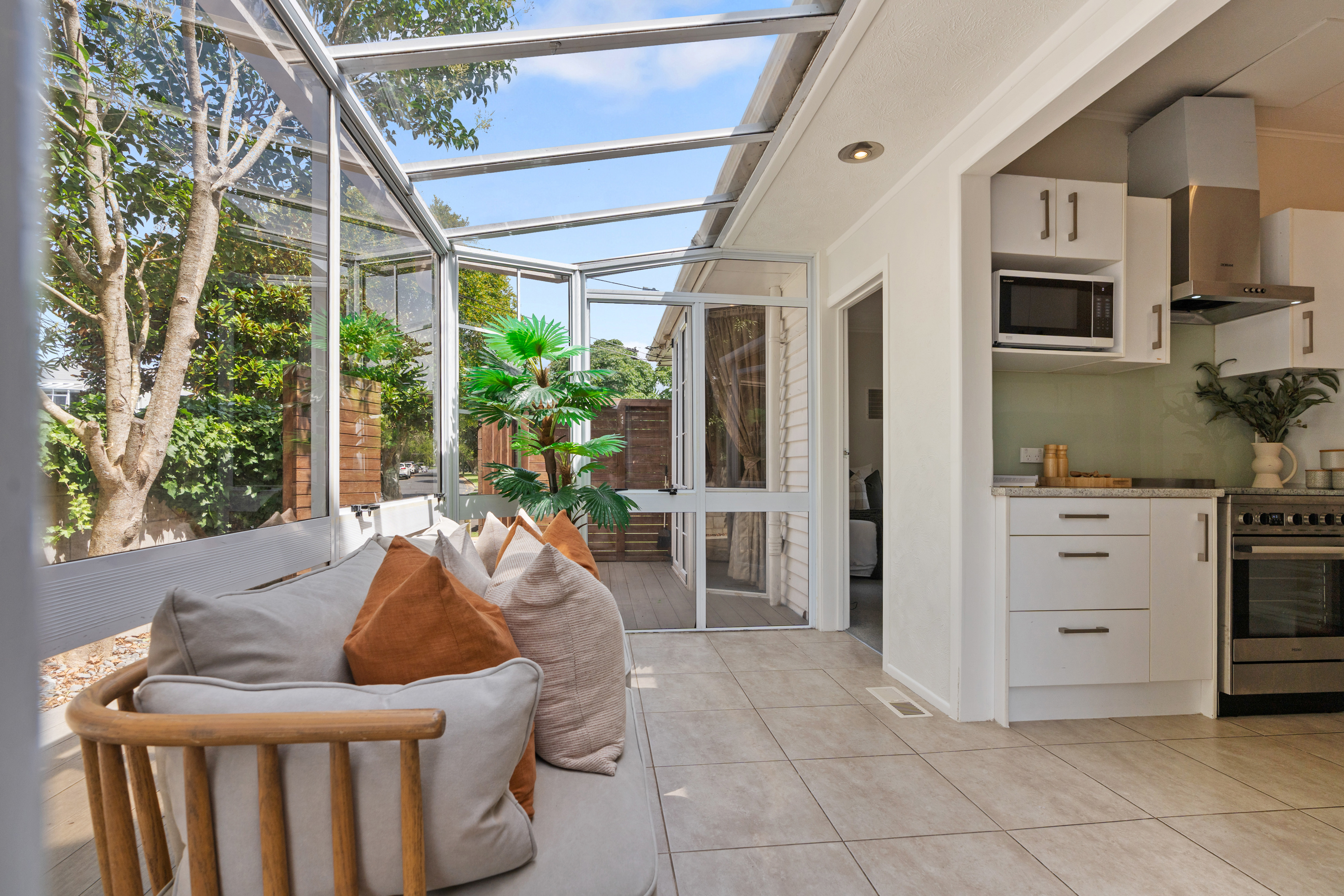 Set over two levels, the lower floor features a well-maintained kitchen and open plan lounge/dining area that opens seamlessly to a covered conservatory and deck - ideal for entertaining and relaxed summer living. Two bedrooms are located on this level, including a generous double bedroom with its own study or nursery, plus a separate bedroom and toilet with its own entrance, making it perfect for guests, extended family, or flatmate flexibility.