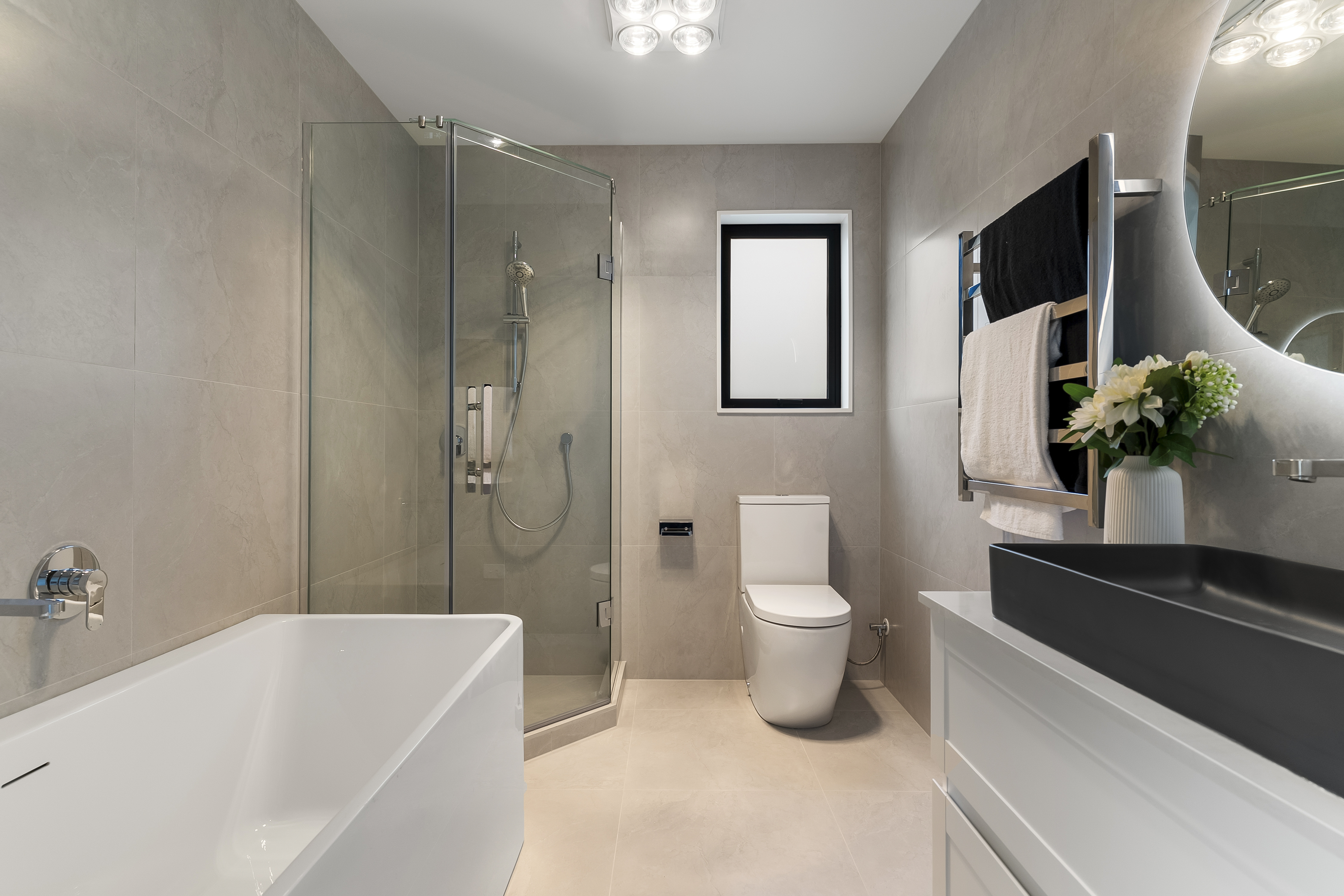 • Underfloor heating in the generous size bathrooms and heat pumps in the living area and master bedroom