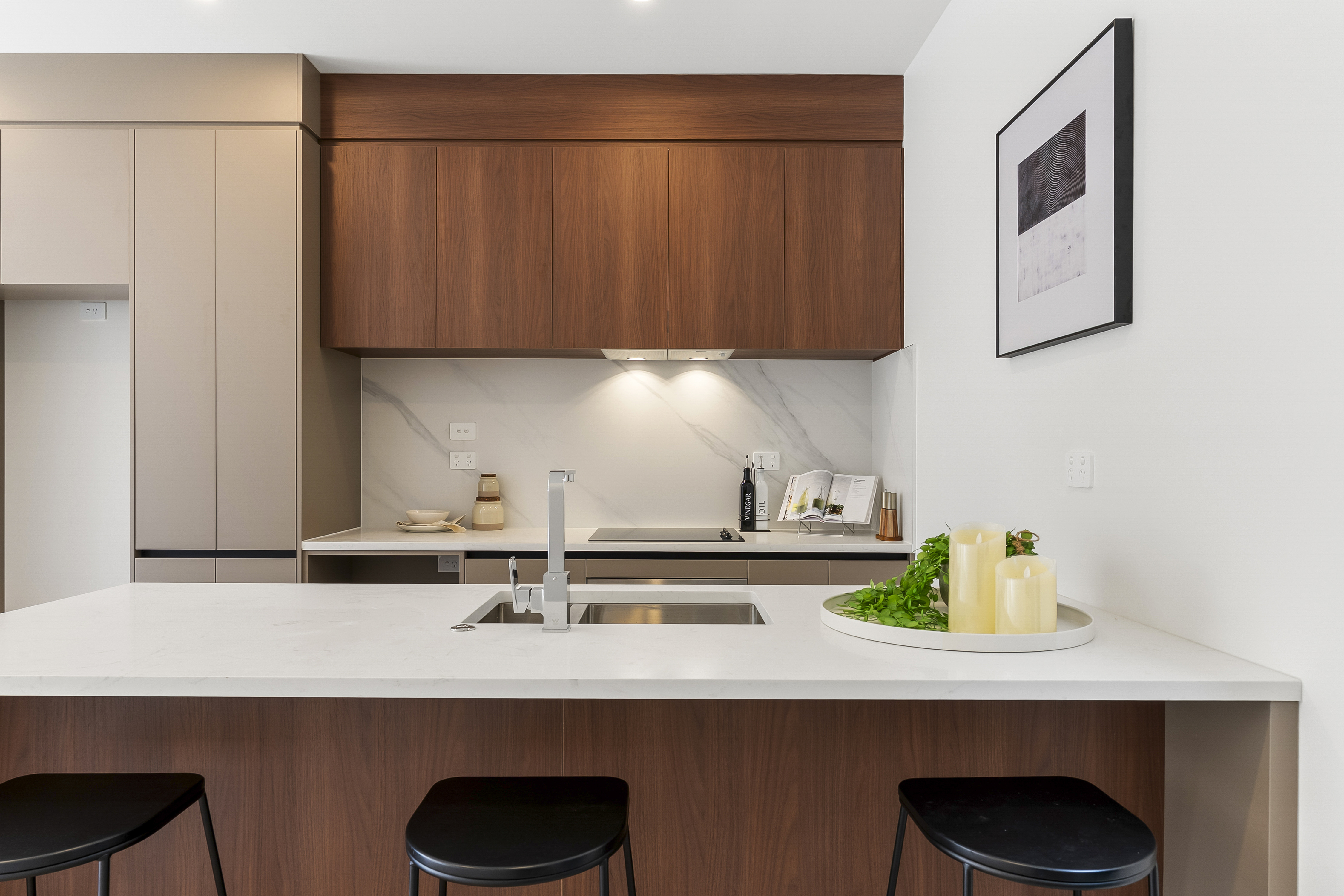 The ground-level living flows seamlessly to an enclosed all weather deck via wide sliders, opening onto a fully fenced outdoor area-perfect for family BBQs or private relaxation. An outdoor power outlet is already installed and ready for a portable spa pool. A convenient powder room on this level adds guest practicality, while the modern kitchen offers ample storage and effortless functionality.