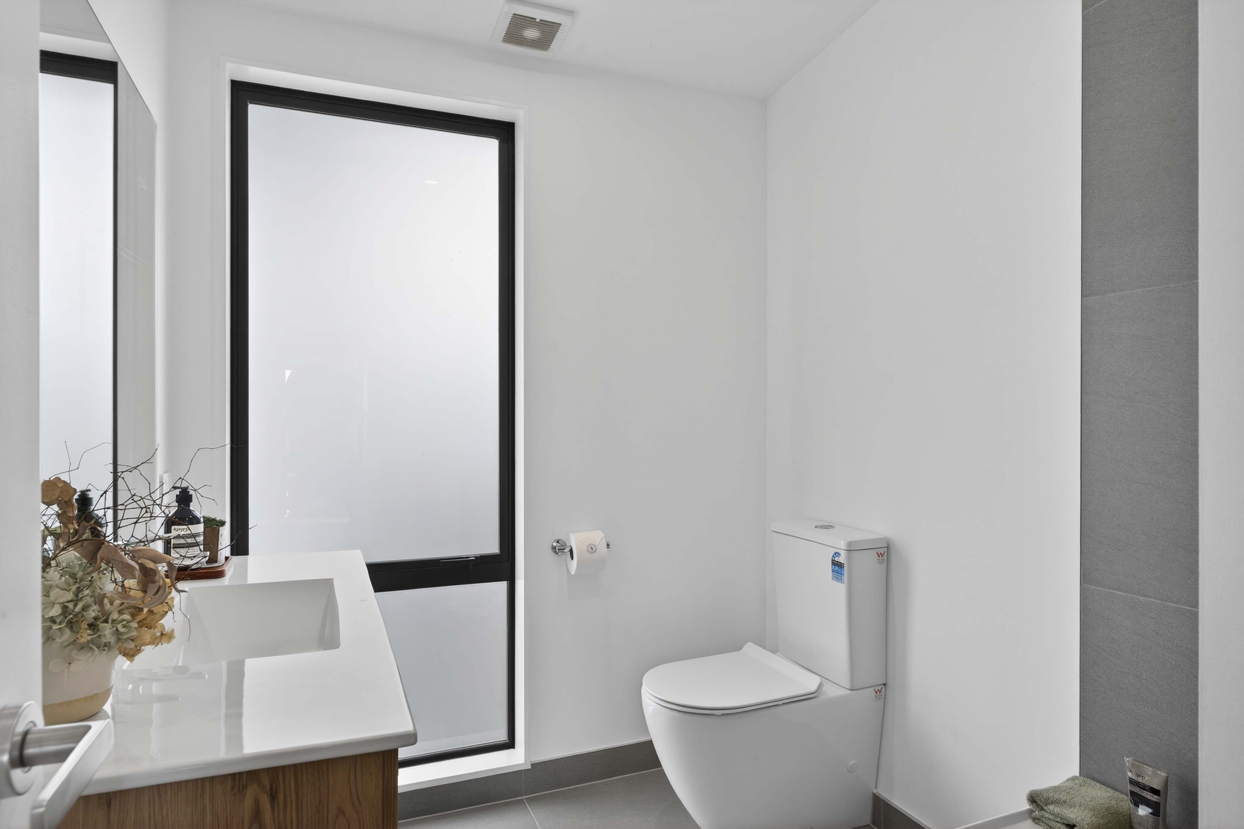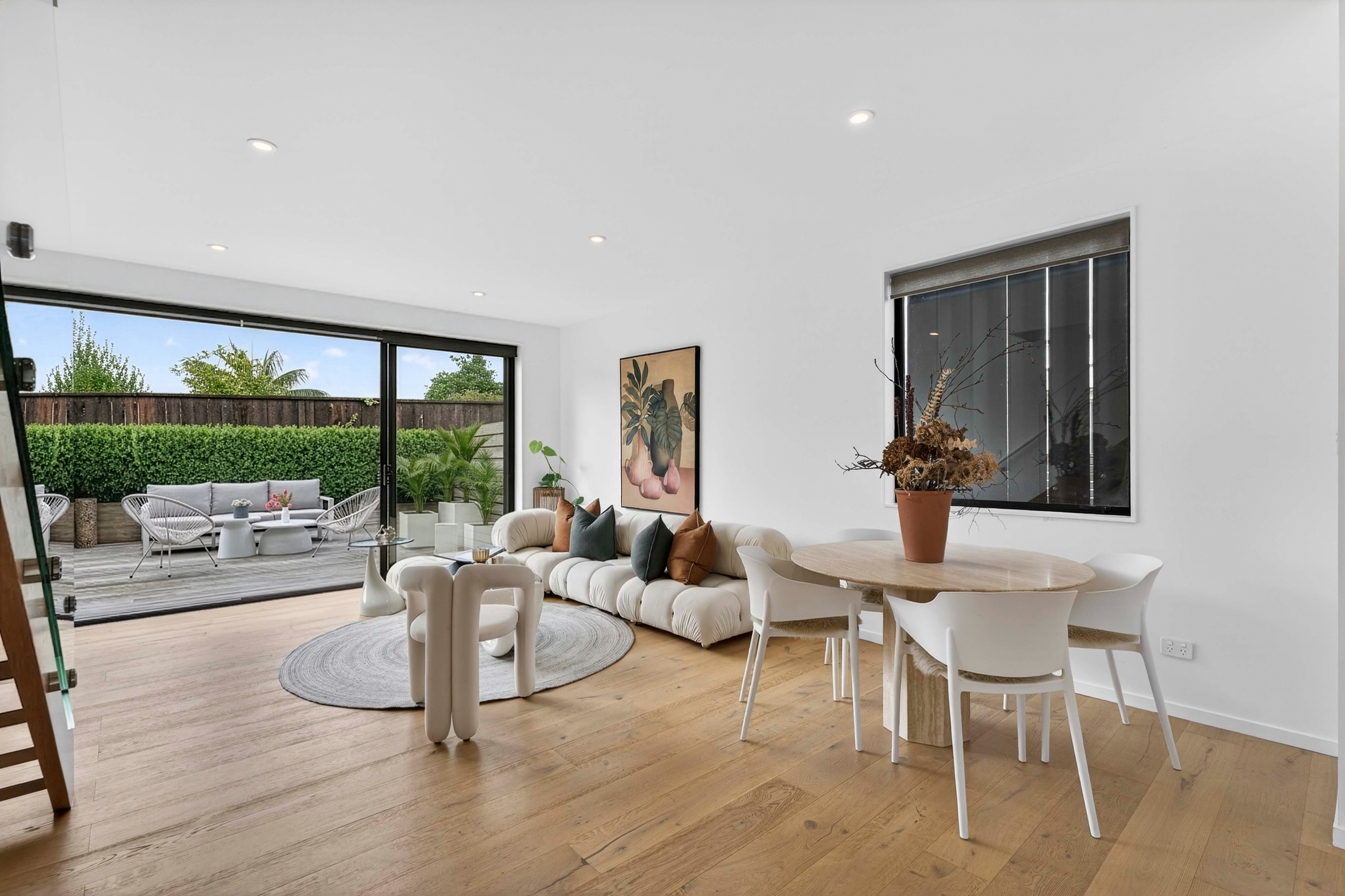 Living moves easily from inside to outside, with the first level opening onto a generous deck that extends the home's footprint. It changes how the home is used, as much for everyday living as it is for hosting. Inside, 2.7-metre ceilings carry a sense of scale, while oak flooring, floor-to-ceiling windows, and a kitchen anchored by a stone island bench with Fisher & Paykel appliances keep things simple and considered.