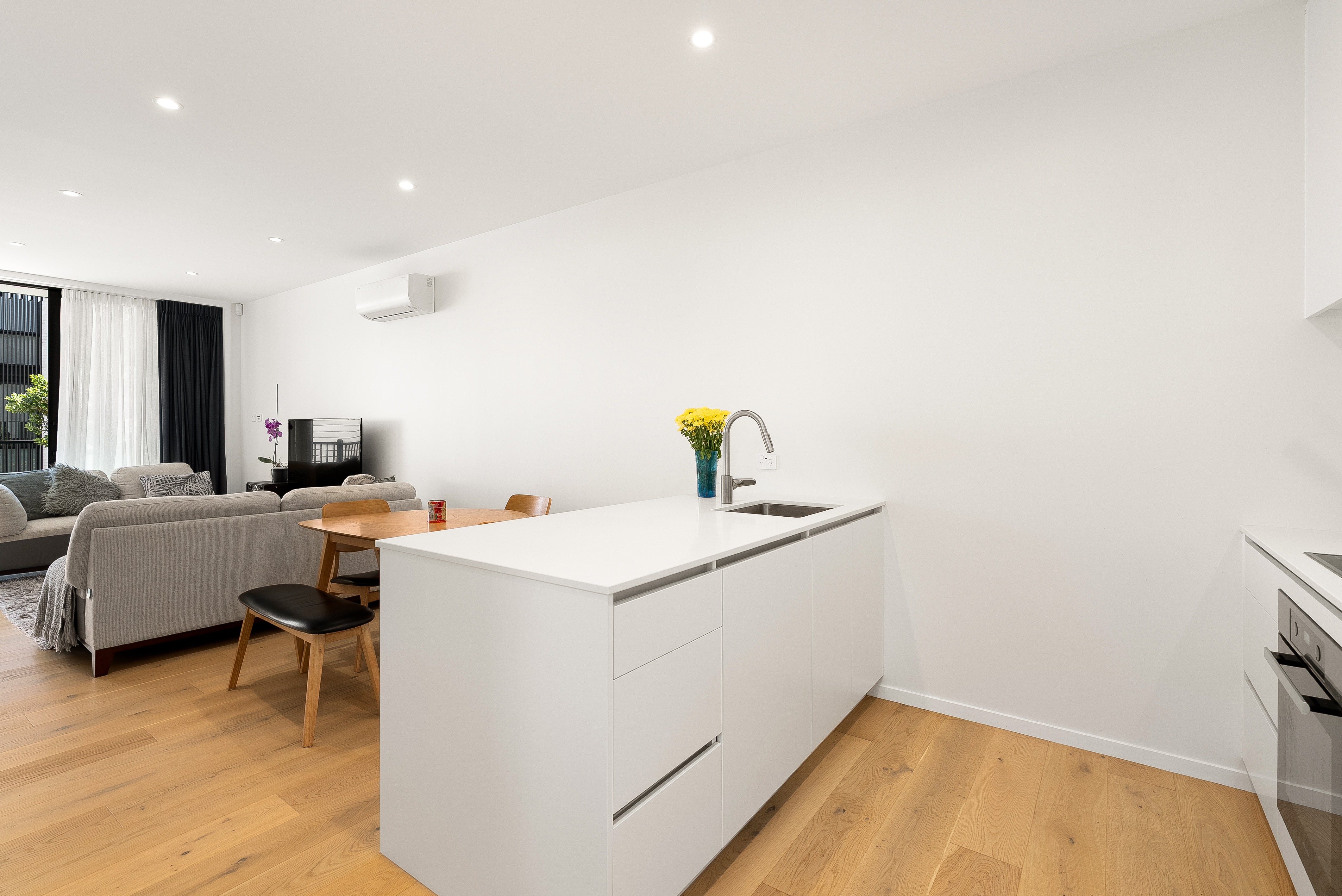 The ground floor is where the home opens up. A generous stud height enhances the sense of space, while natural light moves easily through the open-plan living and dining zone. The kitchen is both functional and refined, with clean-lined cabinetry, premium Miele appliances, and engineered European Oak underfoot. From here, living flows seamlessly to a private, north-facing courtyard - sun-filled, sheltered, and well suited to both entertaining and everyday unwinding. Furnishings on this level can remain for tenant use if desired + built in fridge / freezer.