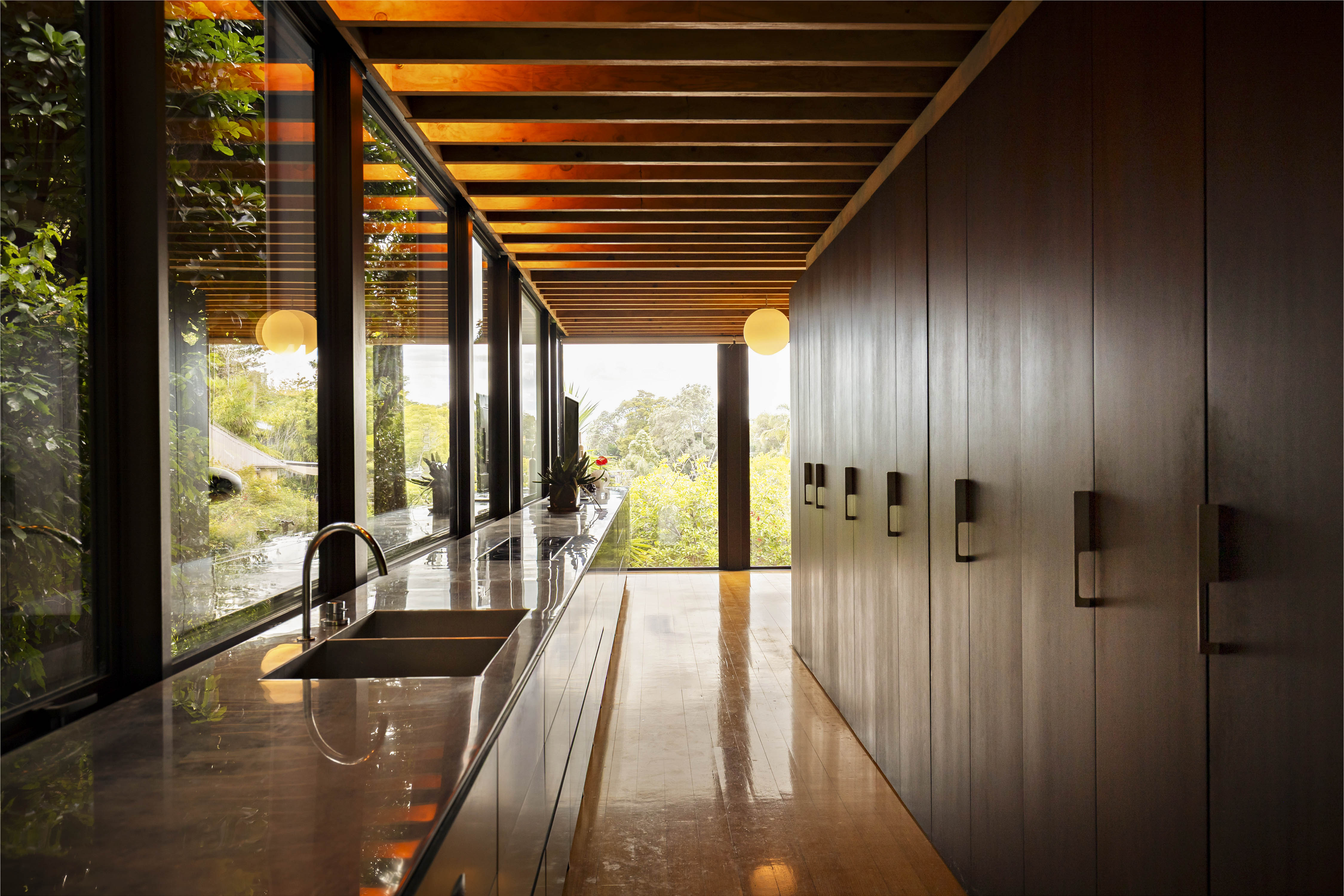 Steel columns carry the form allowing wide expanses of double glazed glass to open the living spaces to greenery on every side. Light moves through the house from morning to evening, changing the atmosphere throughout the day.