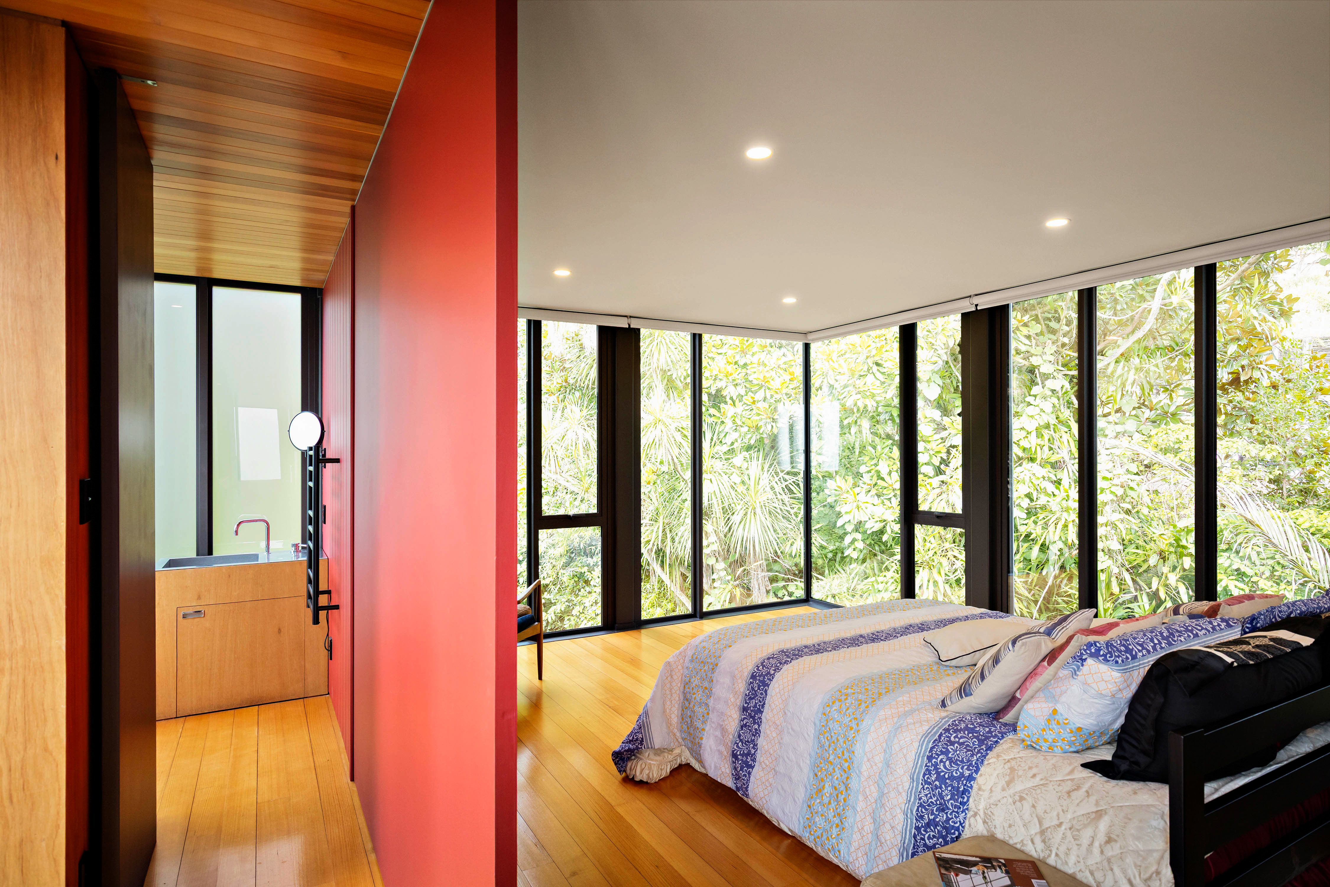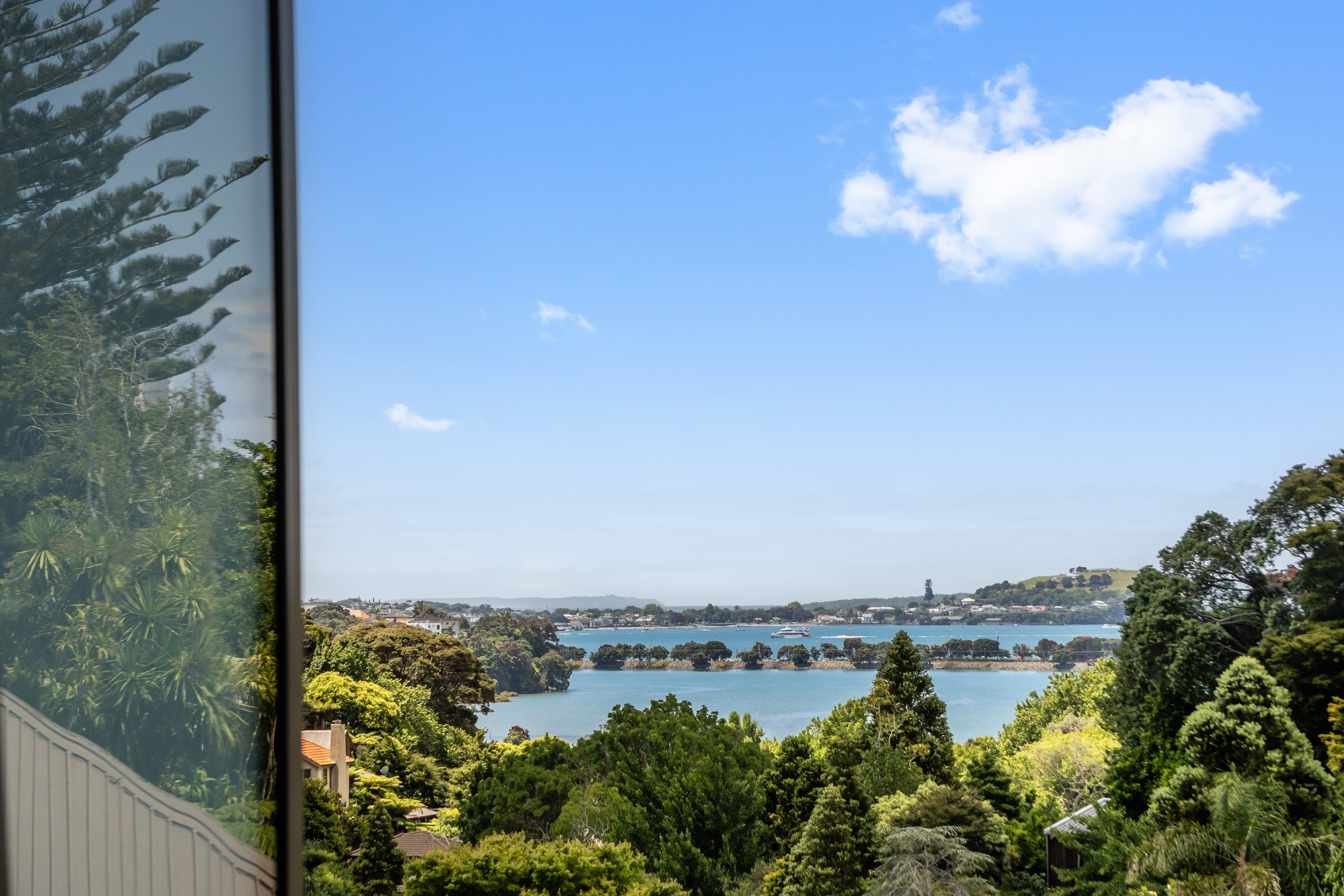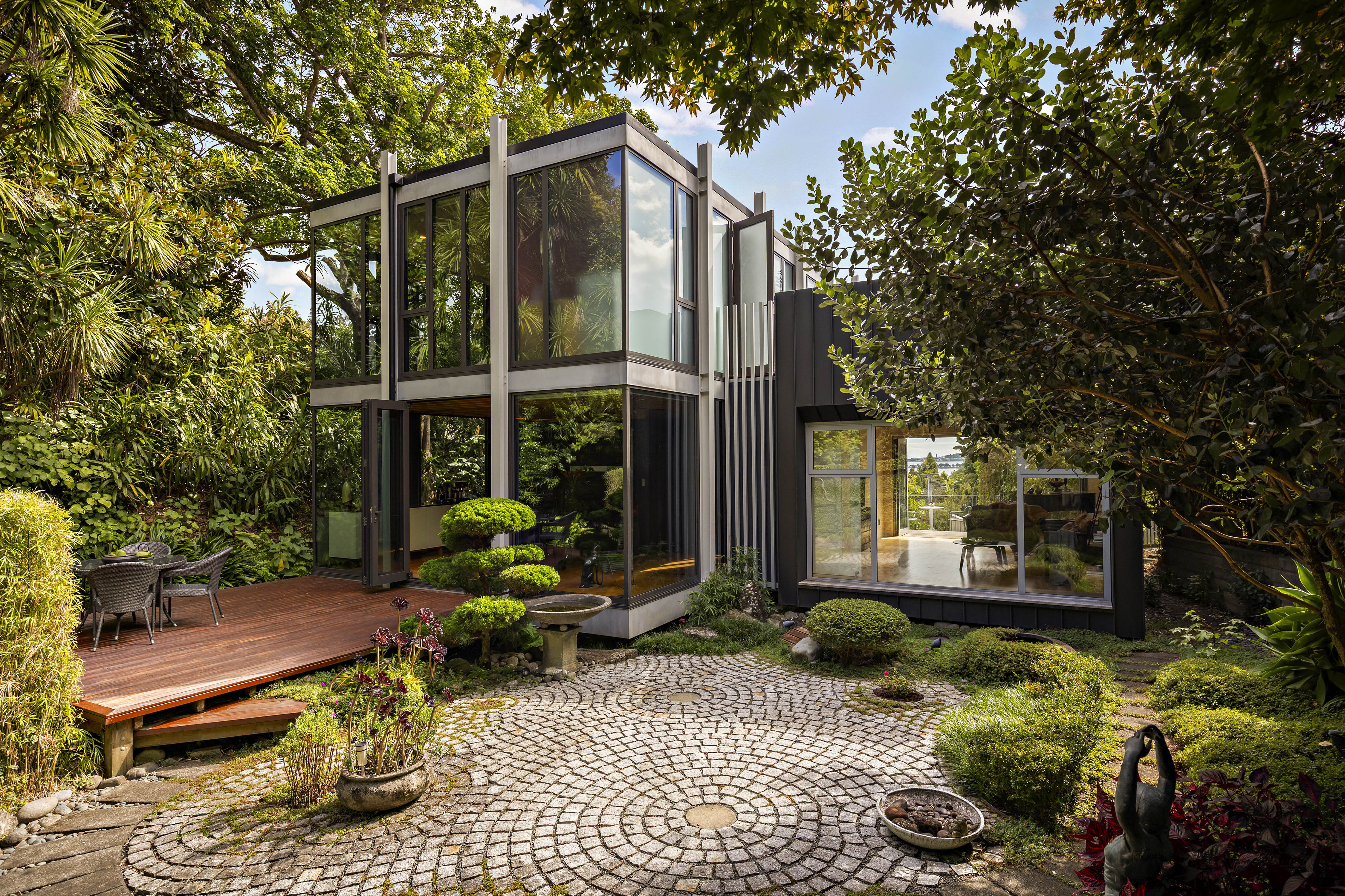 The gardens are an essential part of the composition; beautifully established and carefully arranged. Above it all, a roof terrace offers an elevated outlook across the surrounding treescape to the water - a striking vantage point that completes the home's layered design.