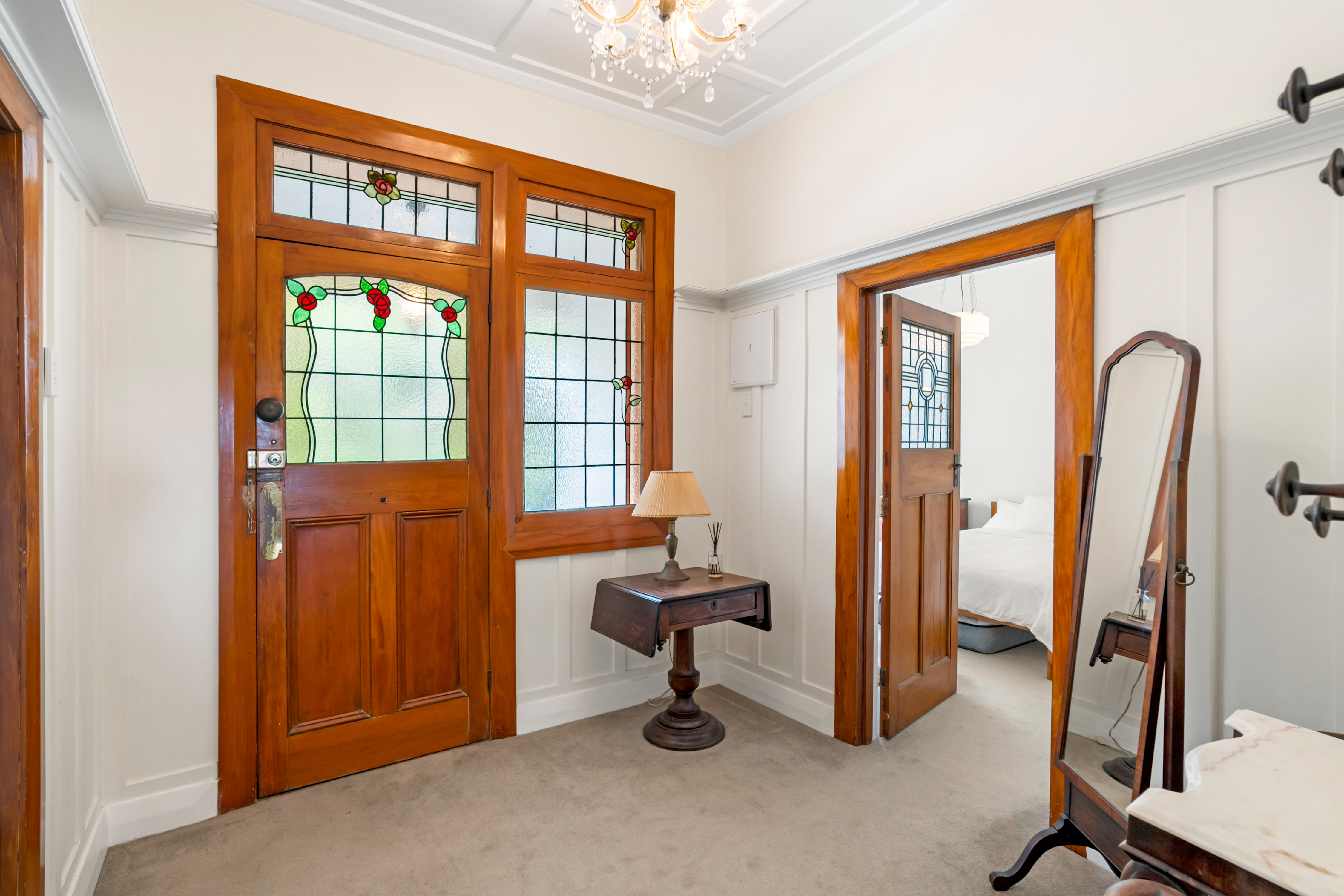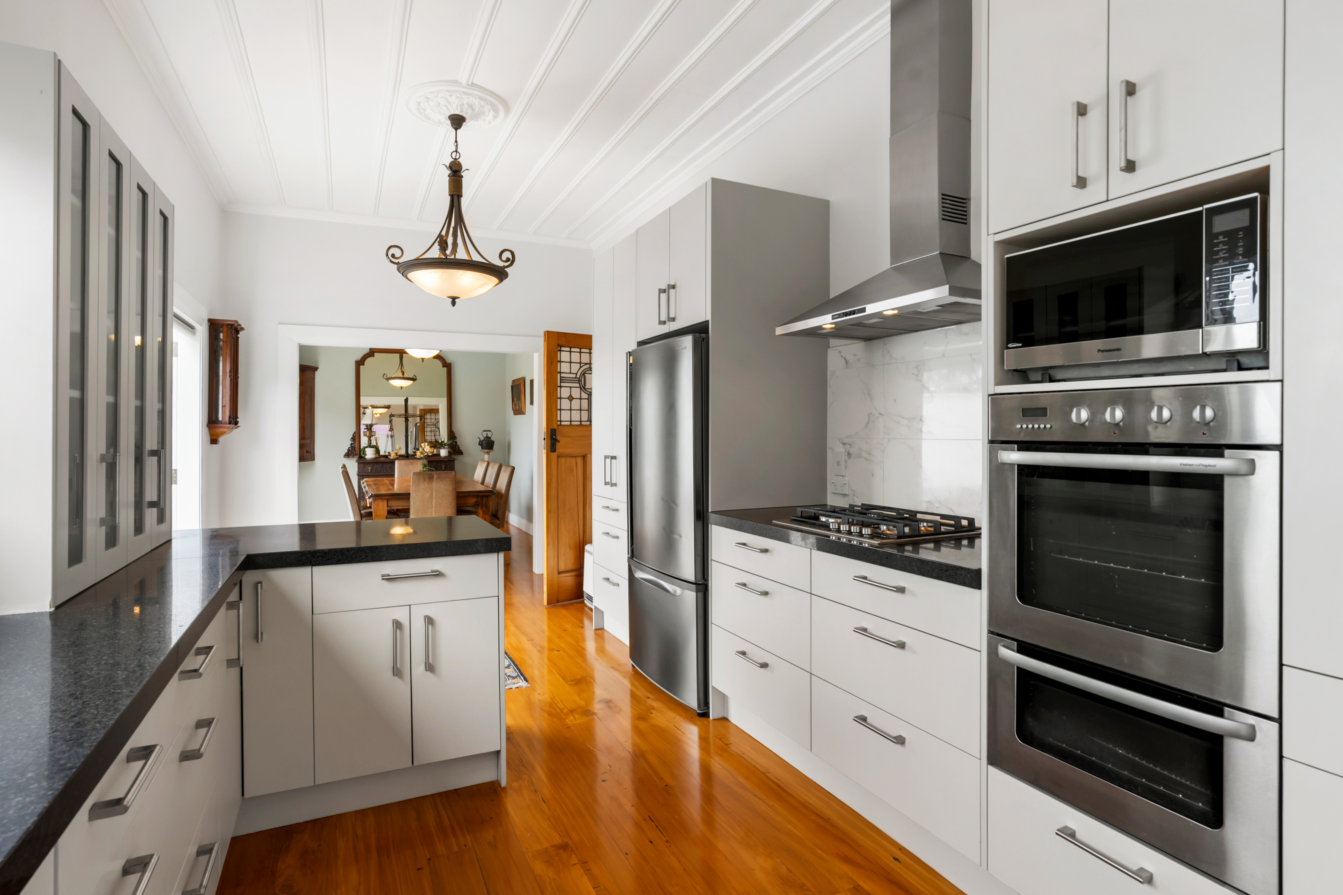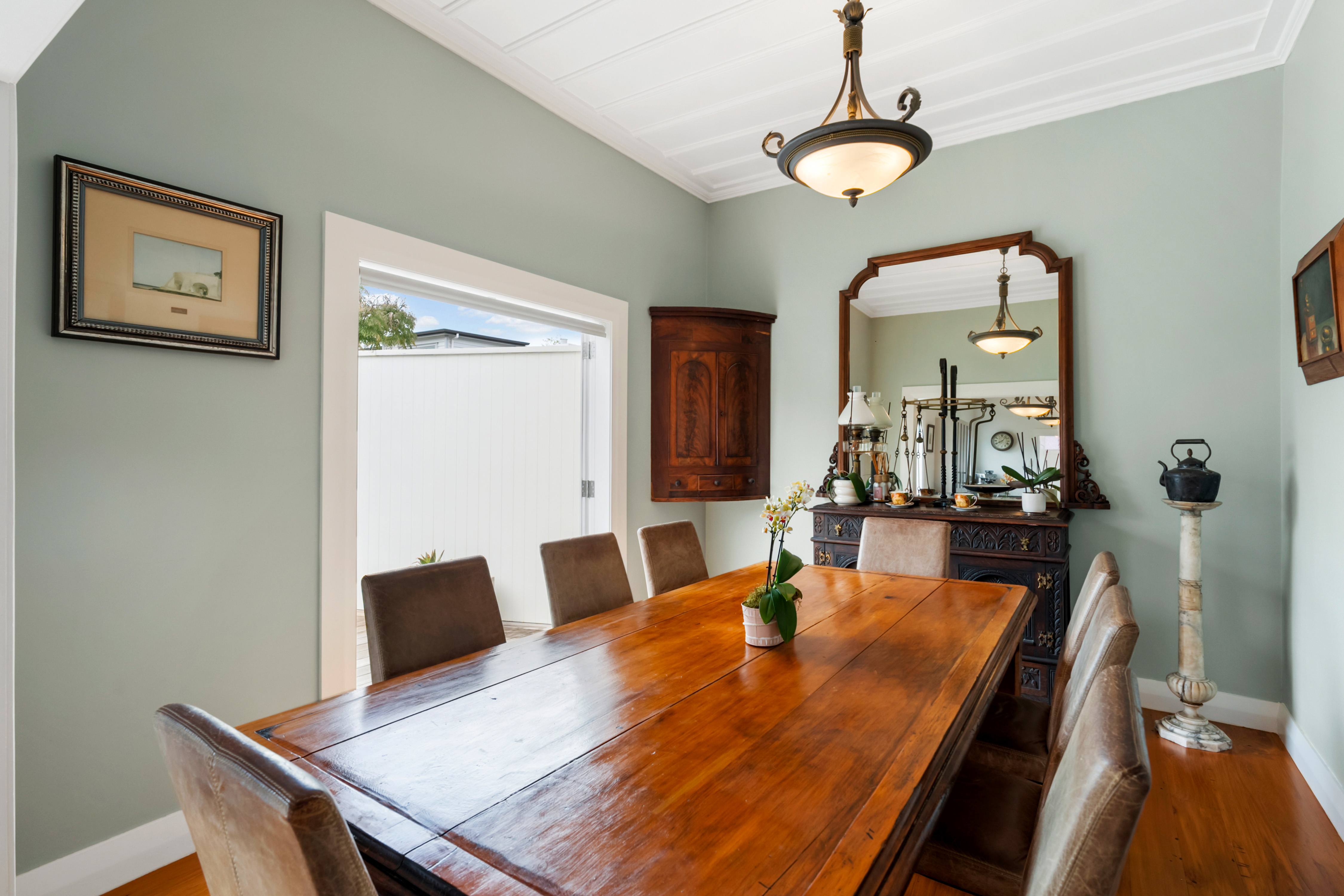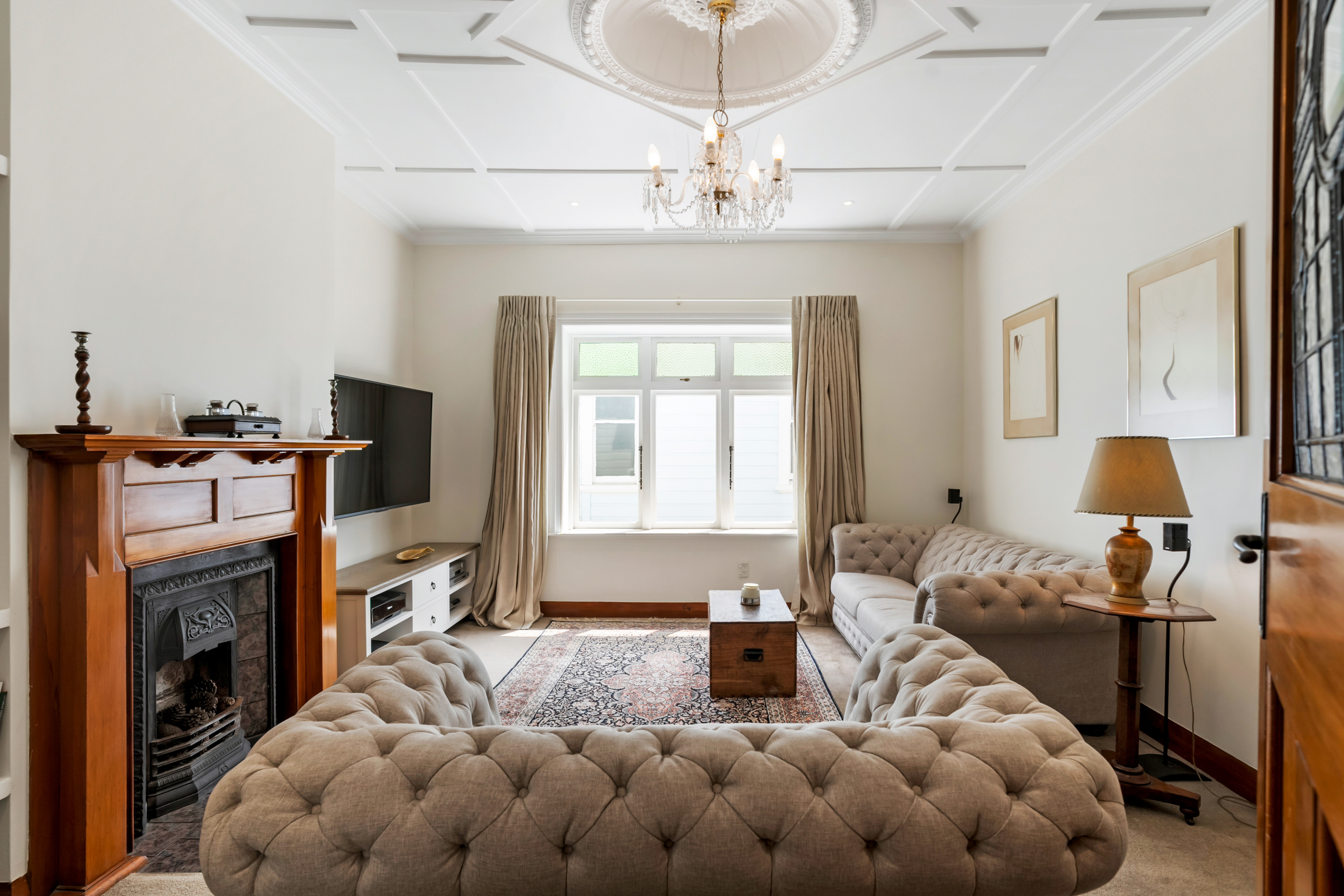 These spaces highlight ornate traditional ceilings complemented by polished timber detailing throughout.