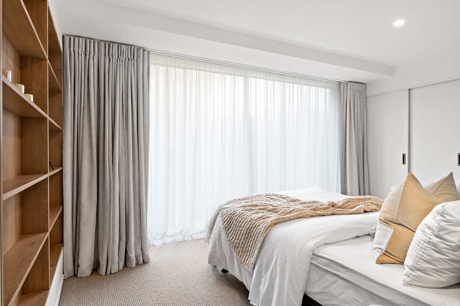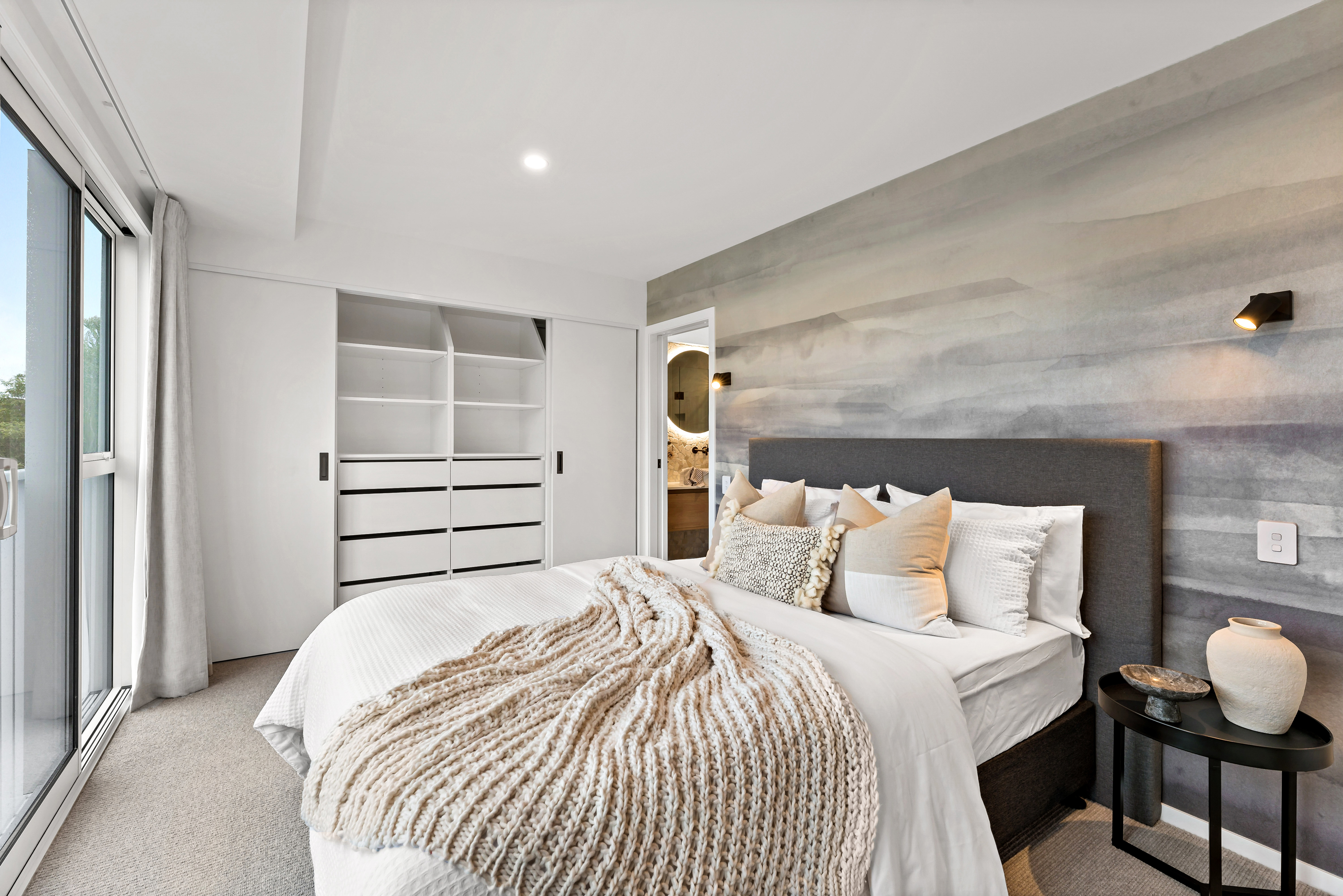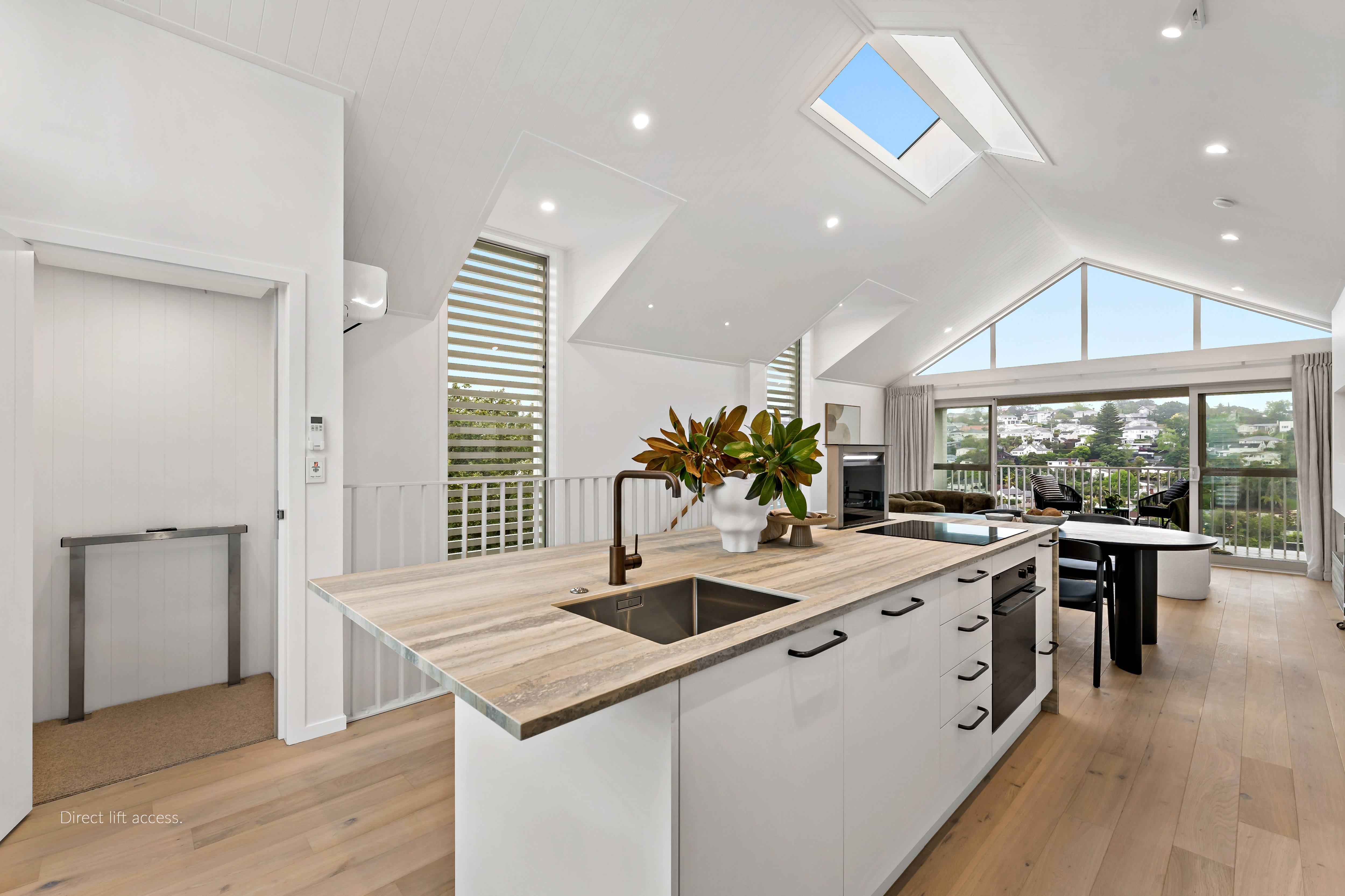 The upper level opens to the west, drawing in the warmth of the afternoon sun as it drops behind Mount Hobson. A restrained palette of stone, porcelain, and engineered timber brings a sense of Scandinavian calm, while the kitchen anchors the living environment with thoughtful proportion and resolved detail.