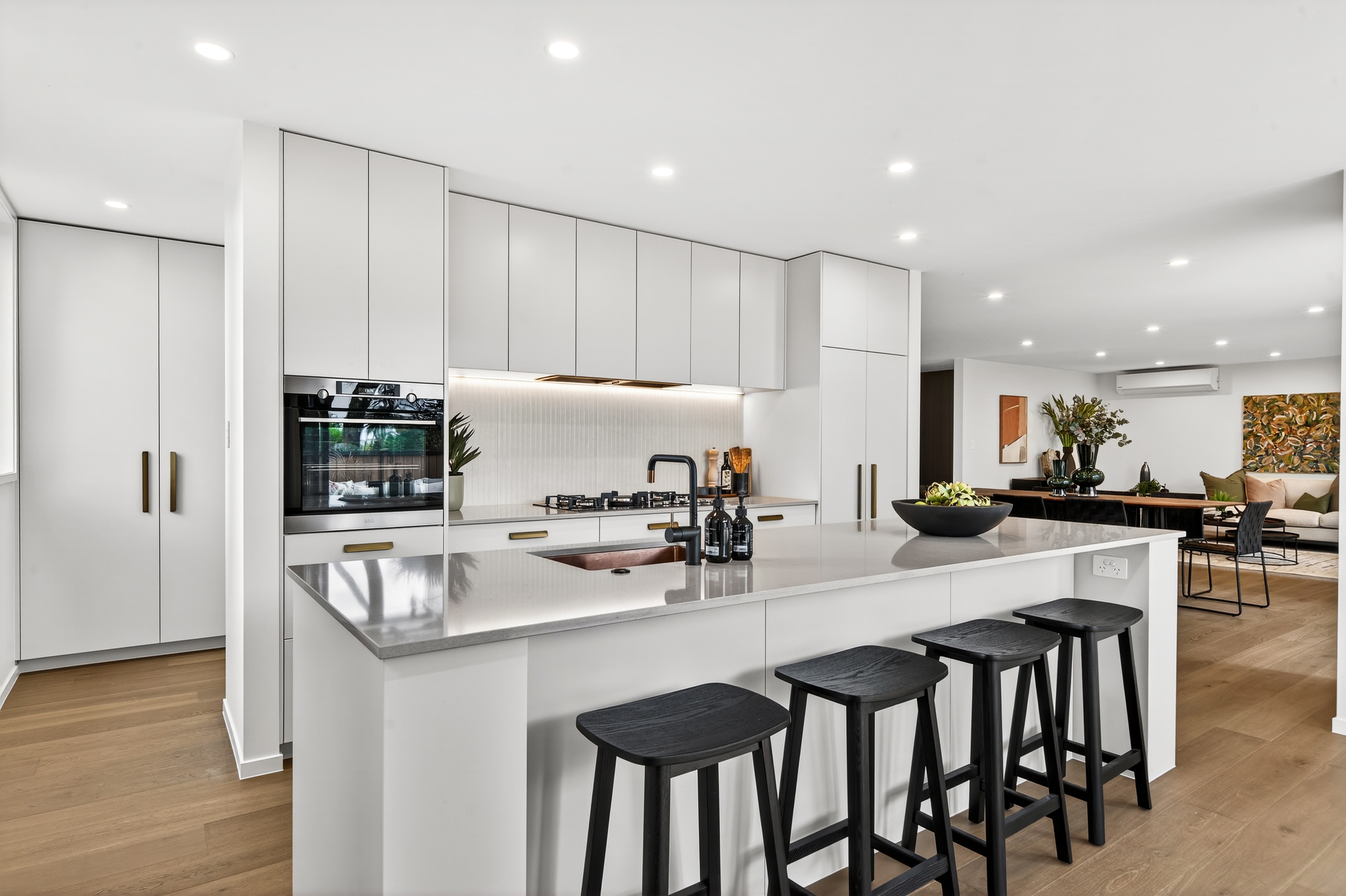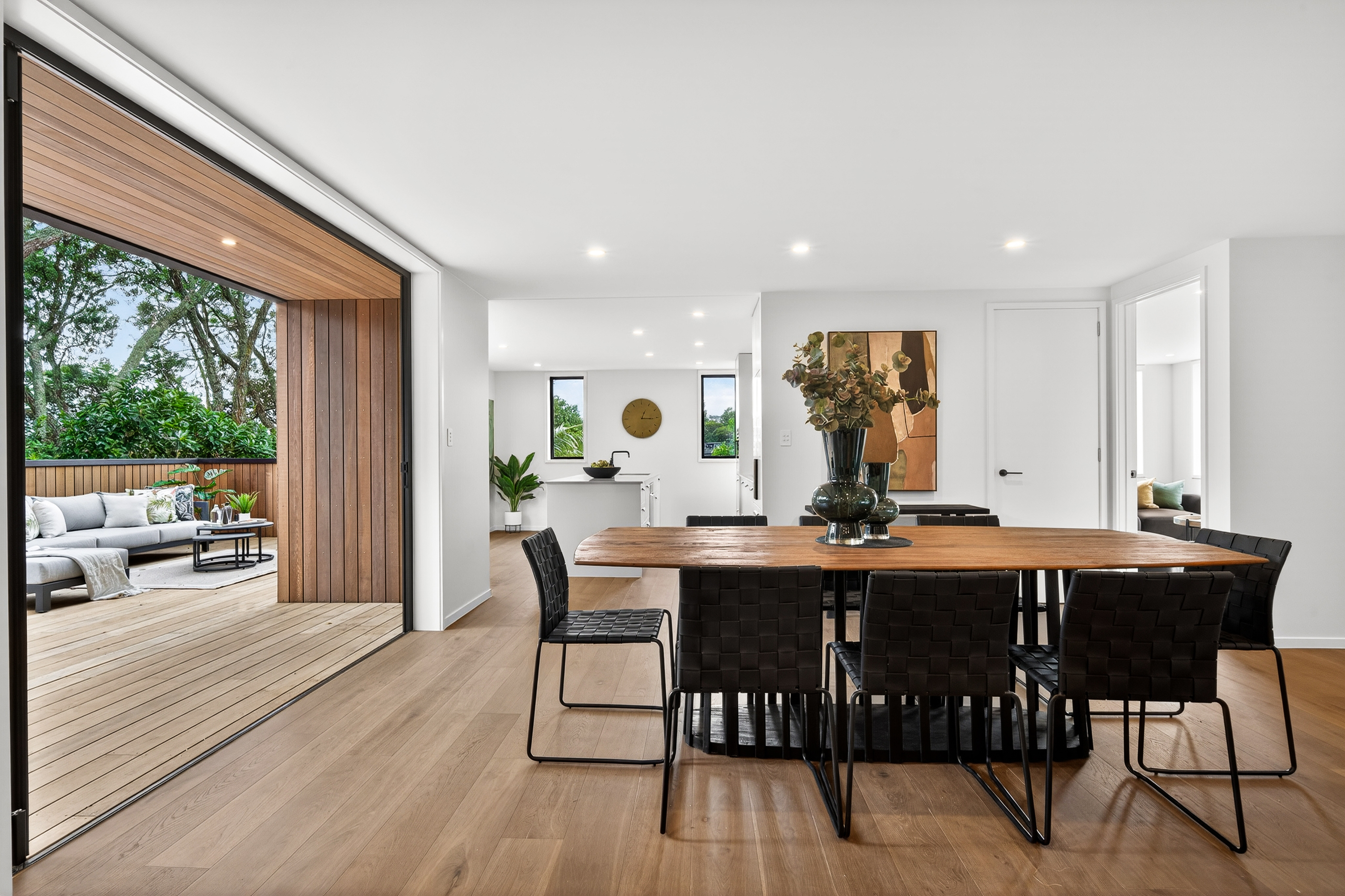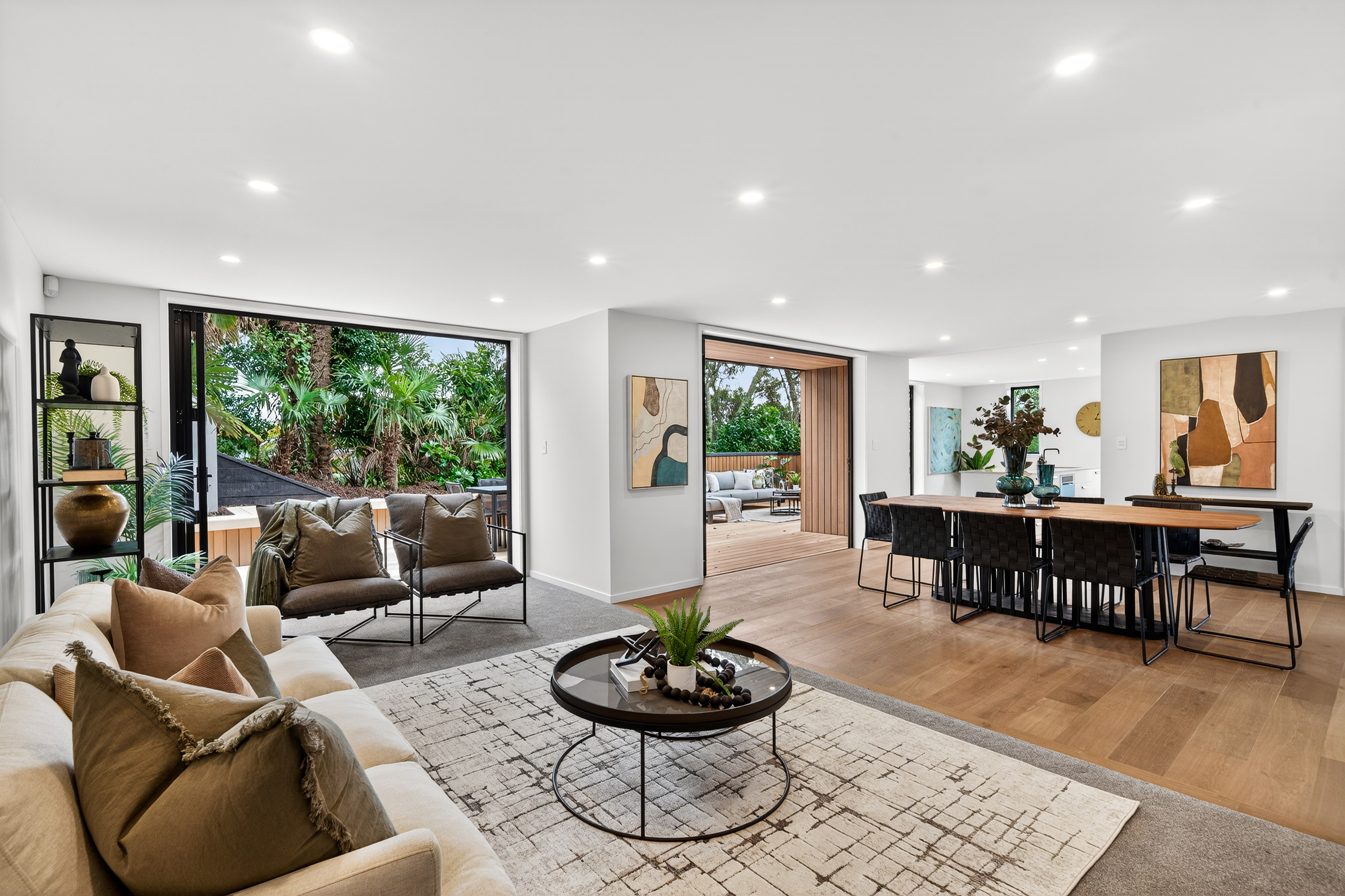 Living and entertaining unfold across multiple zones, anchored by a generous open-plan heart that connects seamlessly to a sun-washed deck framed by greenery. It's a setting designed for long lunches, relaxed evenings, and the kind of everyday living that feels both easy and elevated.