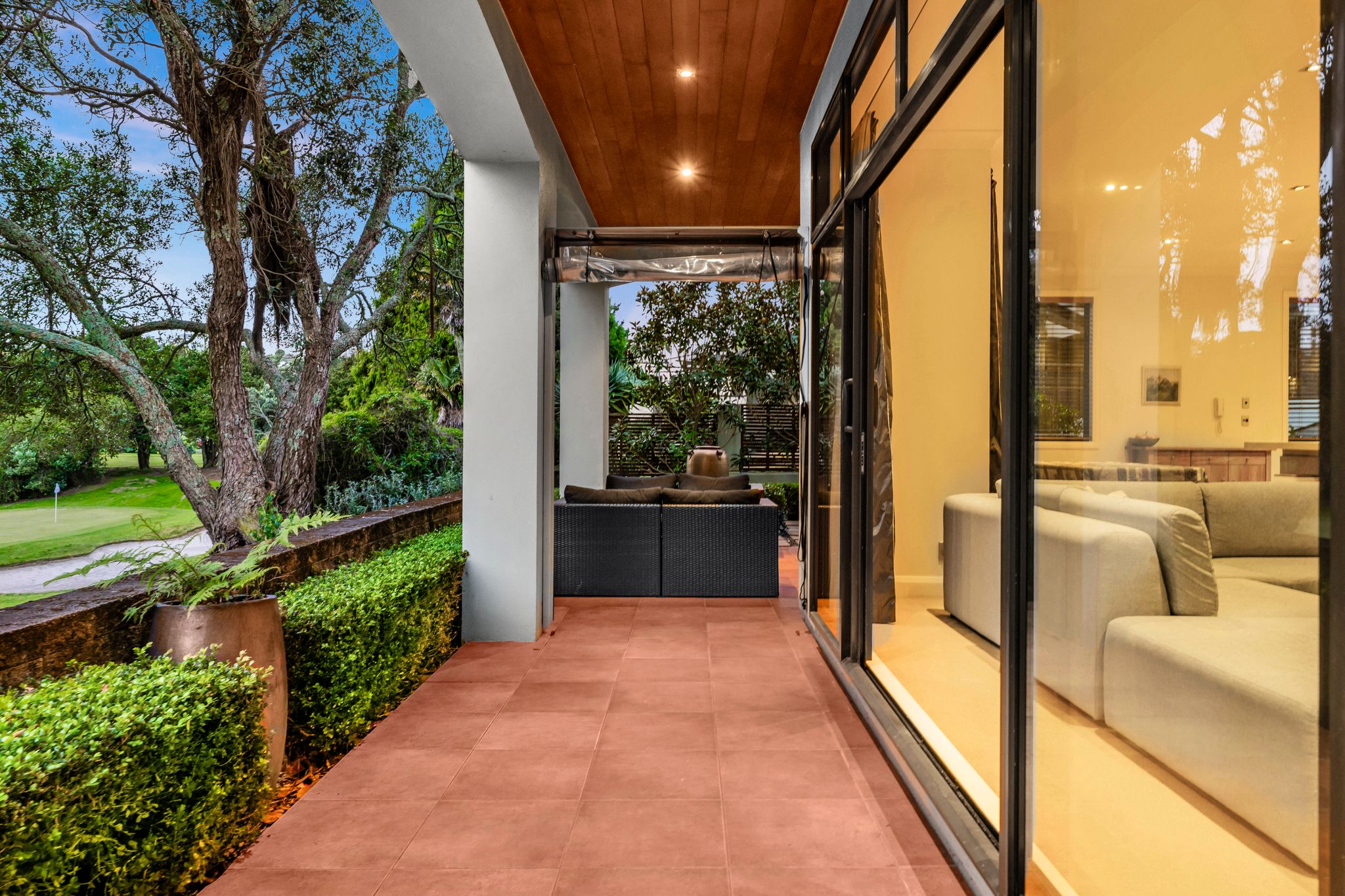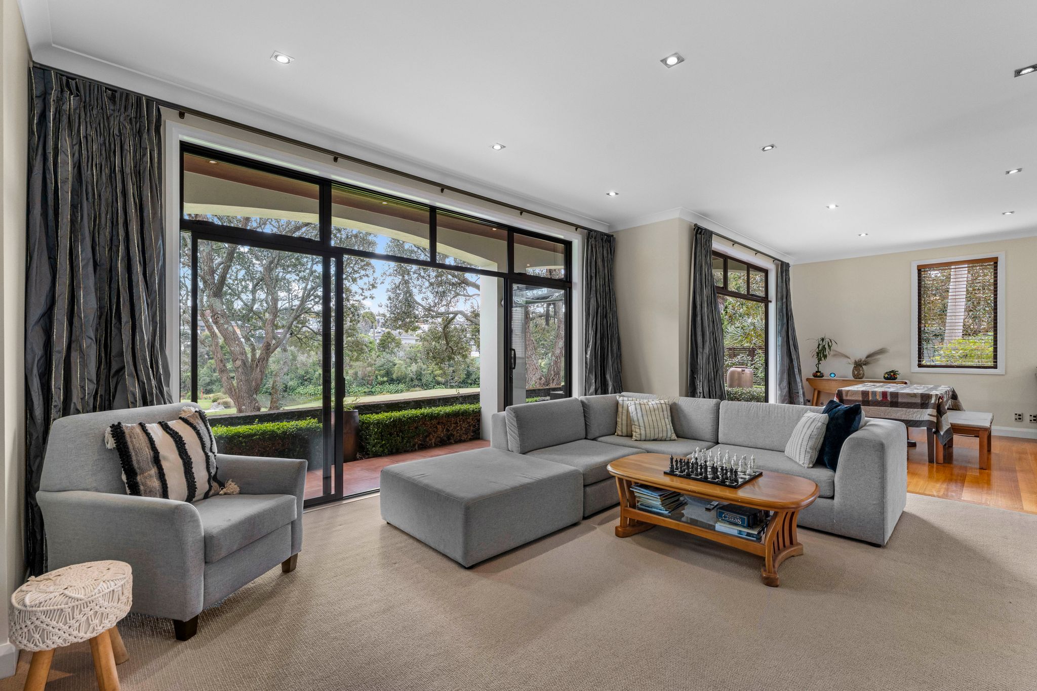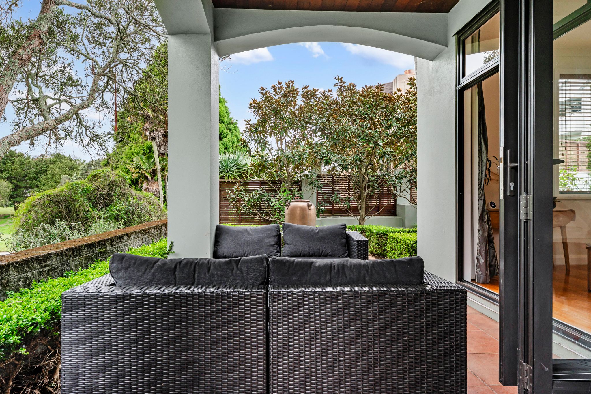 Outside, the low-maintenance section is landscaped and perfect for entertaining, with sunny decking and patio areas that overlook the park-like surroundings of the Remuera Golf course. The partially fenced yard provides a safe space for kids or pets to play.