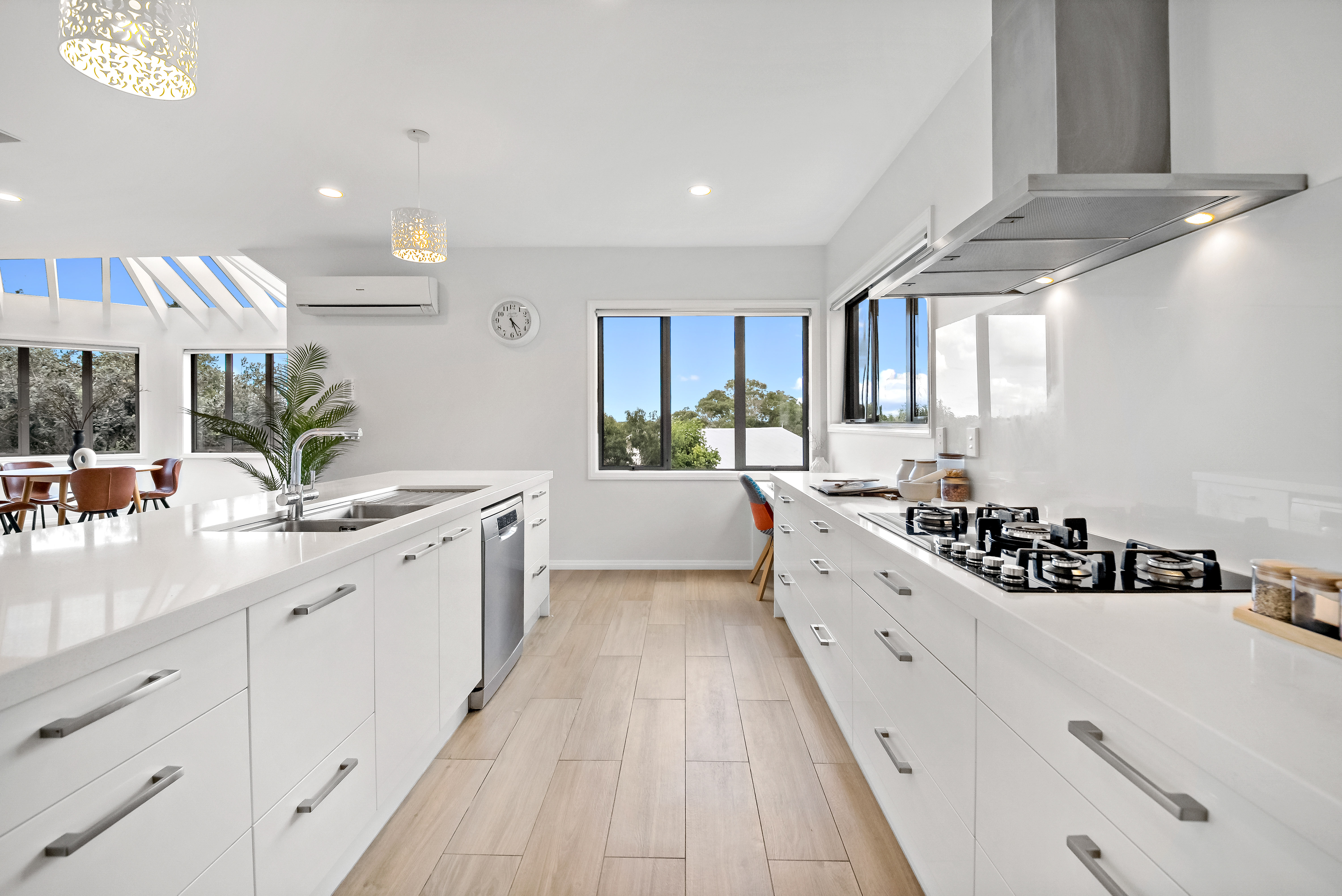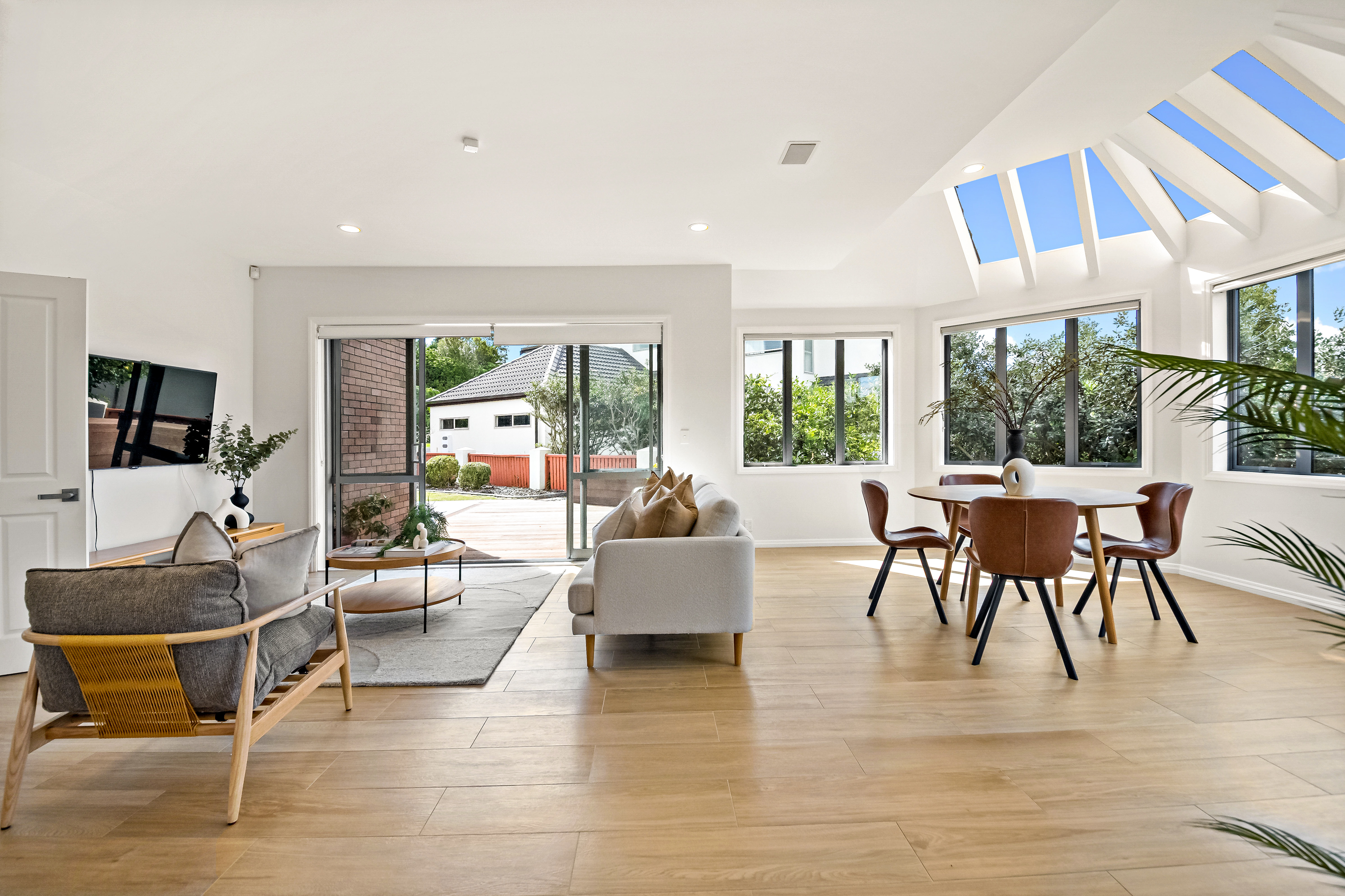 • The two distinct living areas and two dining spaces allow for both connection and separation. Big gatherings can unfold in one zone while another stays available for privacy or to keep the kids in. The open plan dining and kitchen has the feeling of a conservatory - with unique ceiling features letting the sun come flooding in to the pristine and contemporary kitchen.