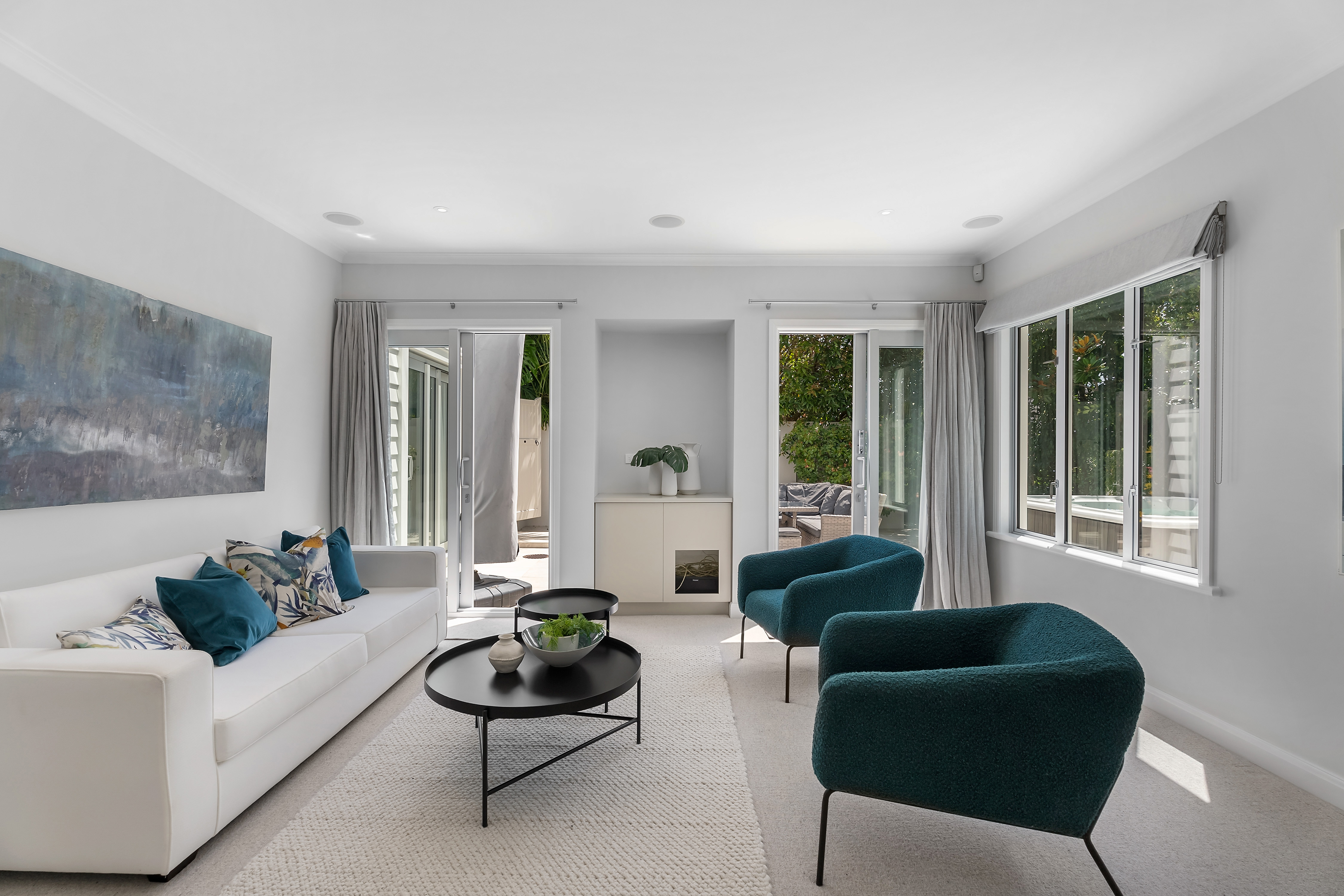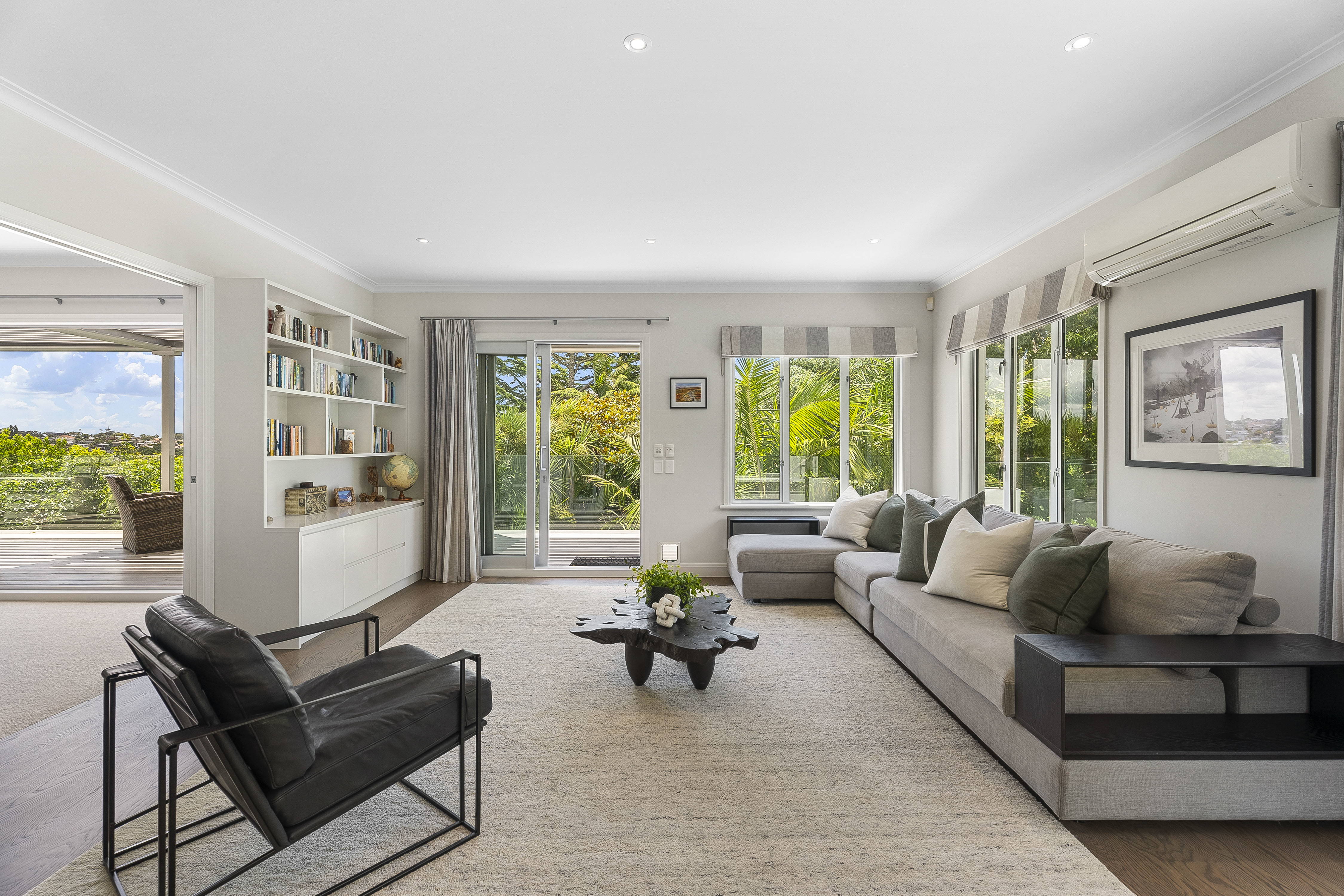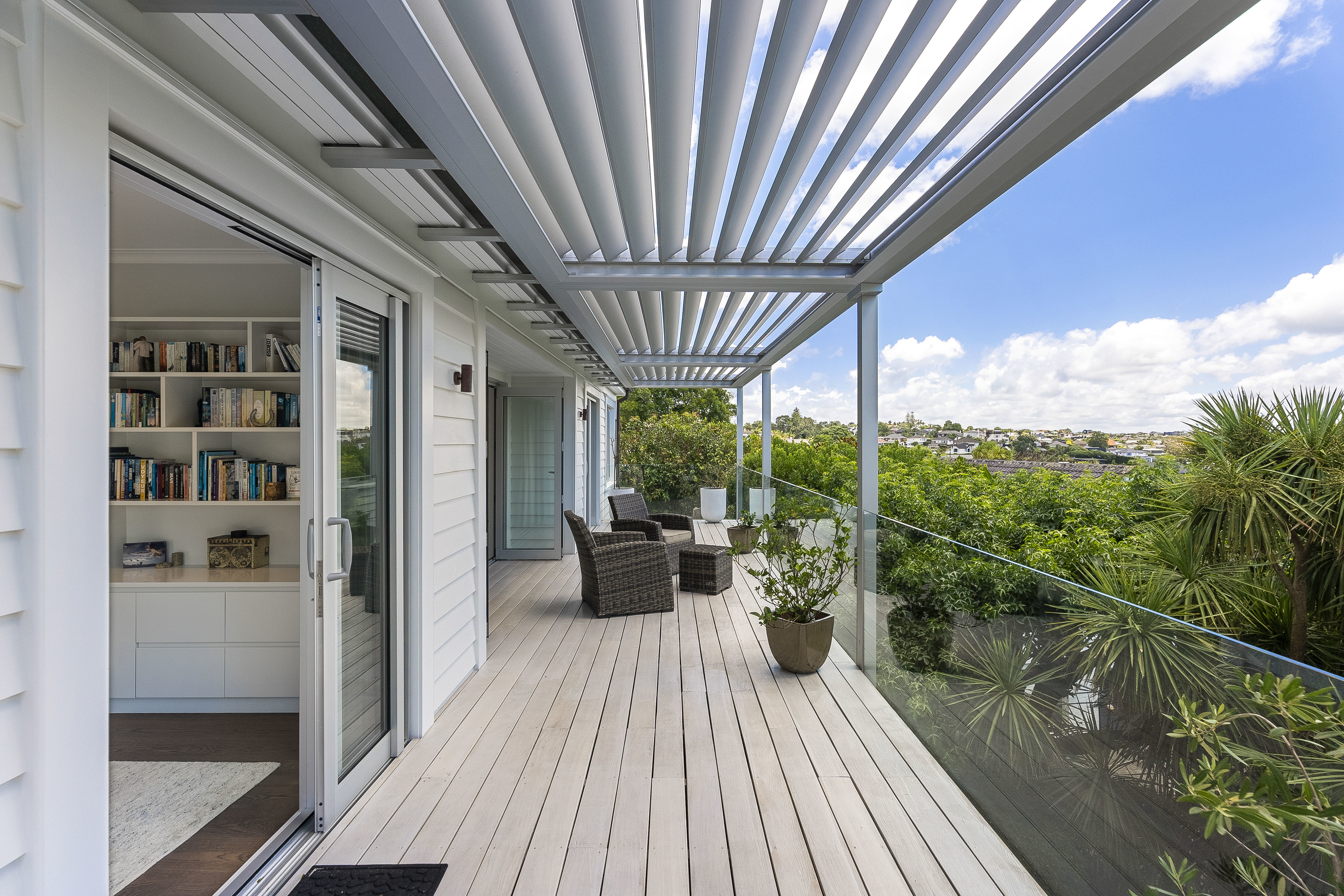 Indoor living flows effortlessly outdoors to a full-width LouvreTec-covered deck, offering a sheltered, all-season setting for entertaining.