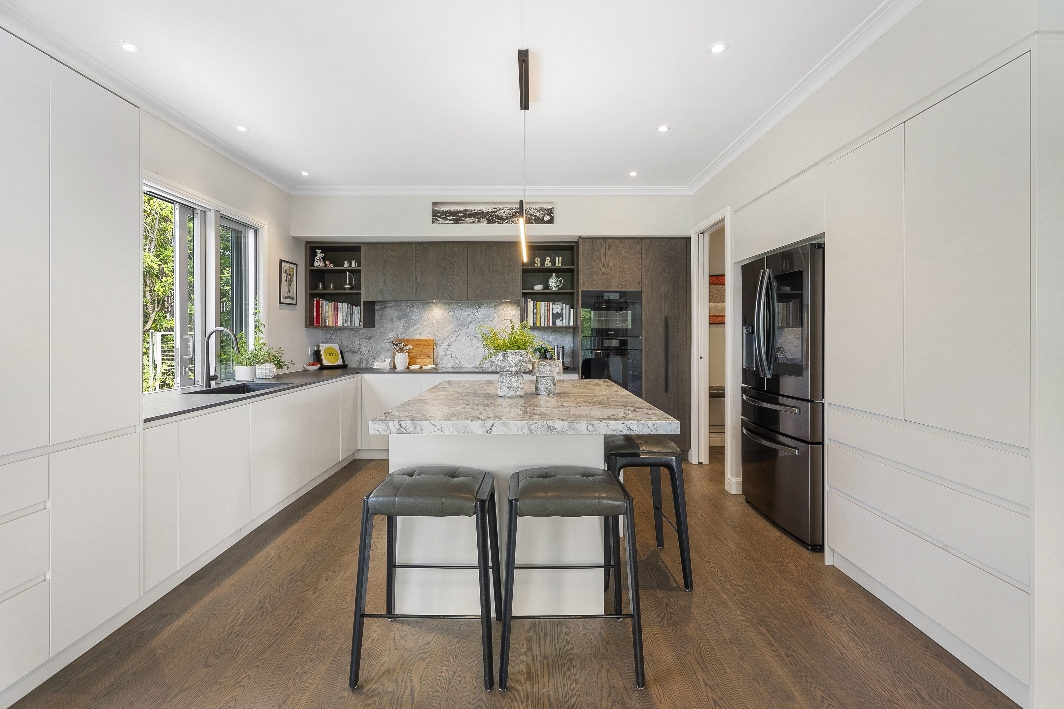At the heart of the home, the designer kitchen with large scullery is both striking and functional, anchored by a high-spec stone island bench and seamlessly connecting to the family living.